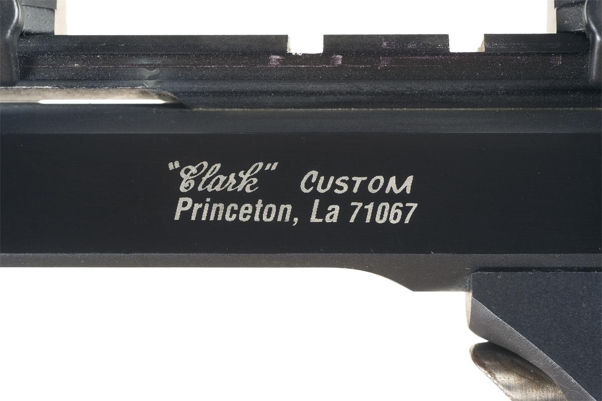 Produced without sights, with the Clark address on the left side of the barrel, a Picatinny rail up top and a Simmons red dot sight. Matching numbers on the frame and slide, with stippled grip straps and a Nill-Griffe right handed target grip with adjustable heel rest and with extra magazine.