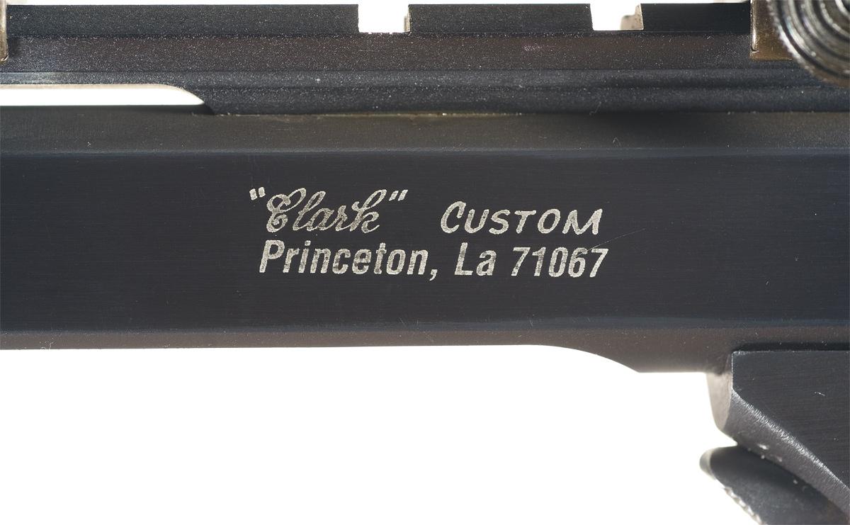 Manufactured between 1966-1968, and fitted with a heavy Clark barrel with Picatinny rail and a Burris Speed Dot 135 Red Dot sight. Standard markings on the frame and slide, with matching numbers, gold washed adjustable trigger, stippled grip straps and right handed thumb rest grips. With an extra magazine.
