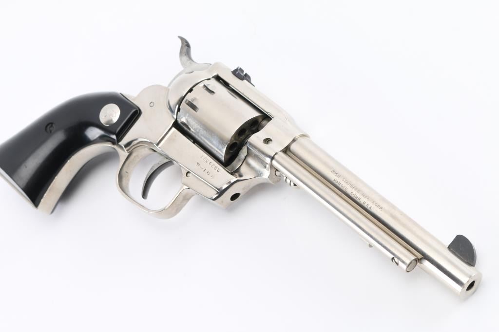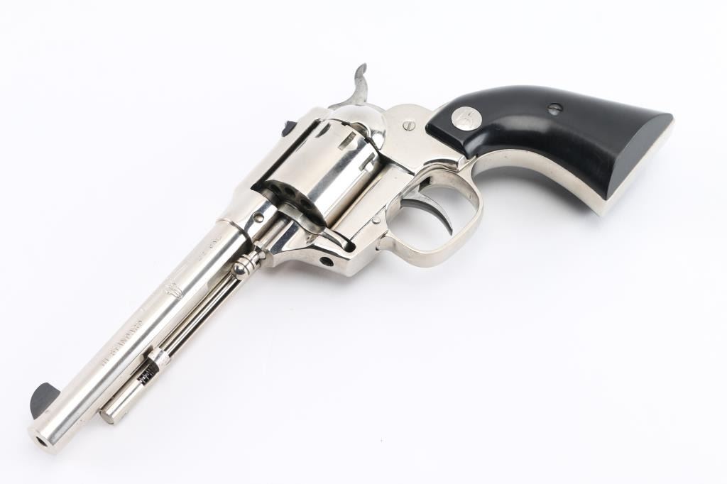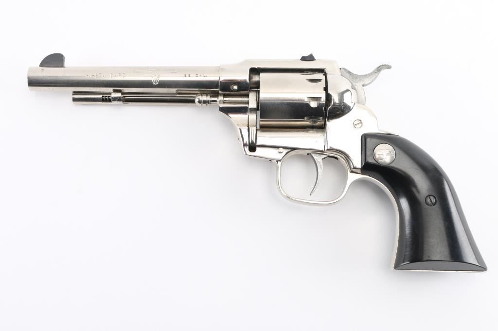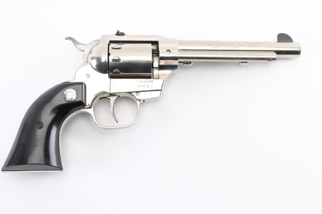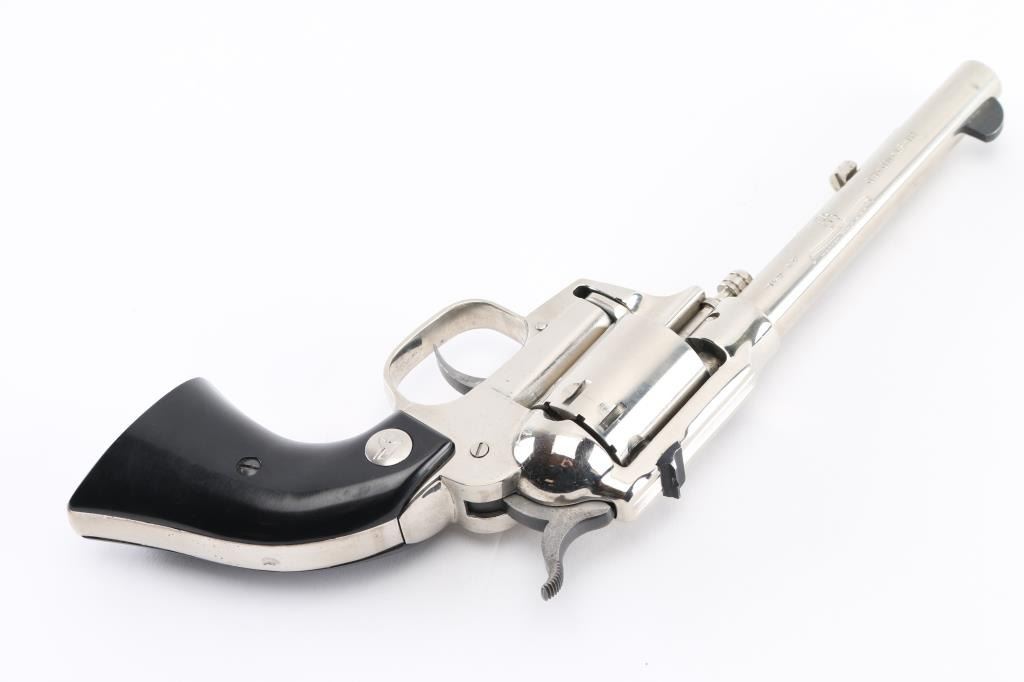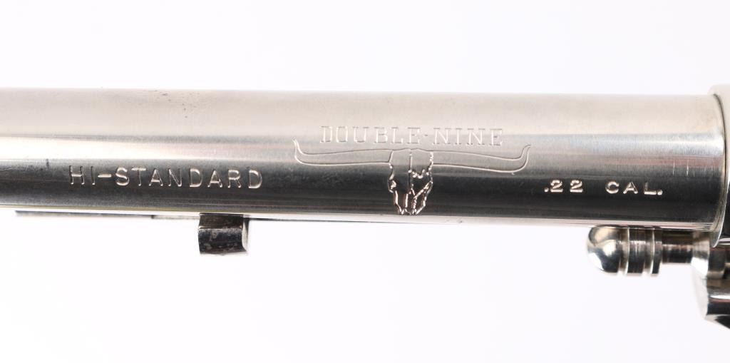 'W-104' Western styled double/single action revolver manufactured circa 1967. Features fixed sights (rear in dovetail), 5.5" barrel, swing out unfluted 9 shot cylinder, cylinder release styled to look like the ejector rod on a traditional single action revolver, nickel finish, smooth black polymer grips with nickeled High Standard logo medallions. Bore is very good condition. Nickel finish is very good, with some scratches, few blemishes. Grips are very good with small dings. Action is smooth with good lock-up. Condition is NRA Very Good++ *** C&R Firearm ***