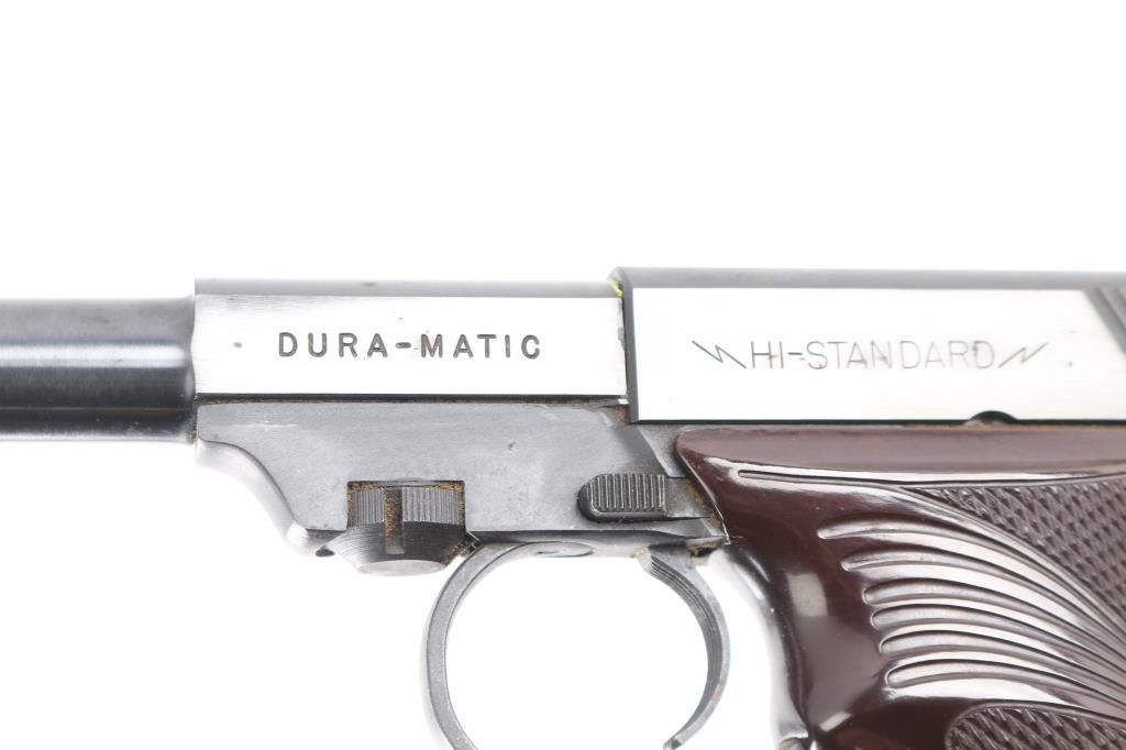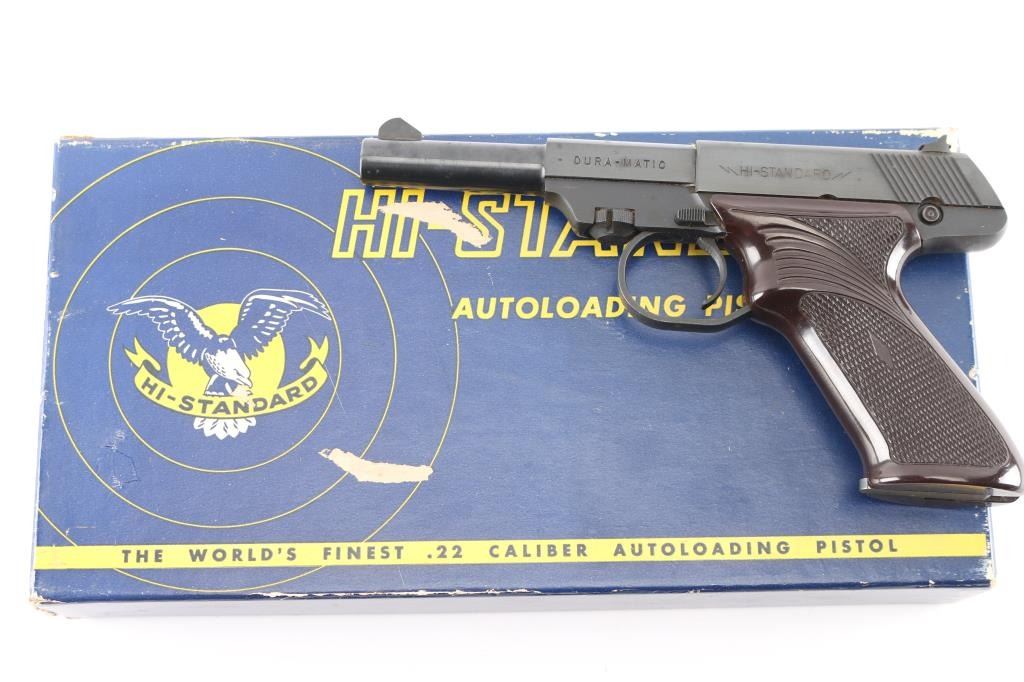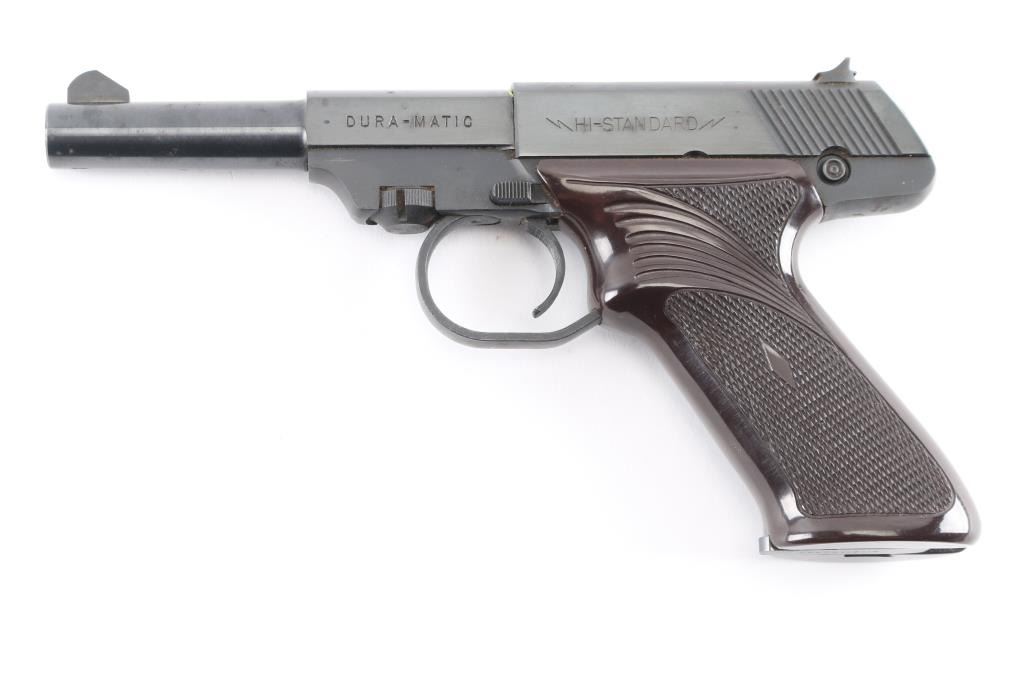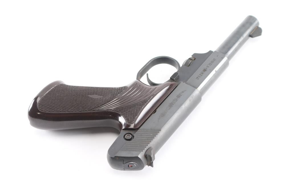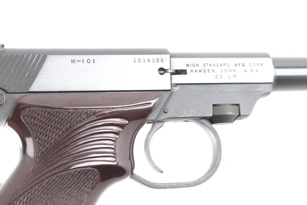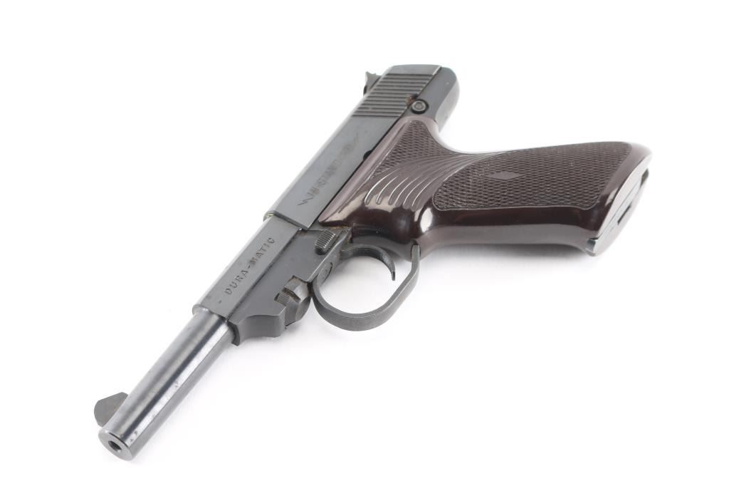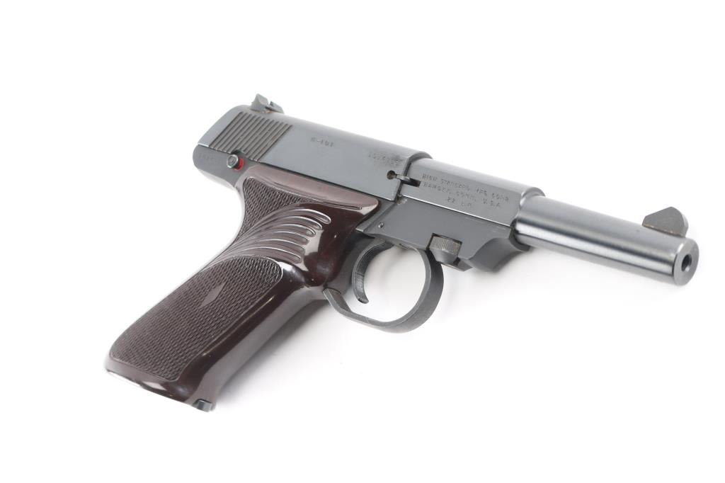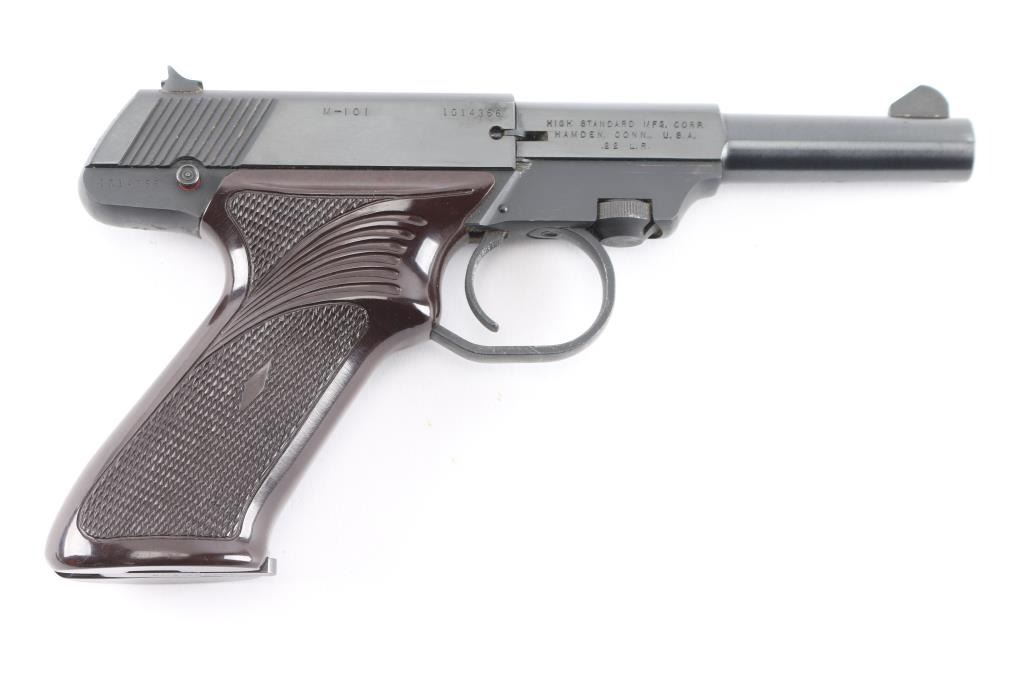 'M-101' Semiautomatic pistol chambered for 22LR. Features blued finish, brown plastic checkered one piece grip covers most of frame, blade front sight, rear sight mounted in dovetail, manual safety doubles as slide lock, cocking indicator at frame rear, 4.5" barrel. Bore is very good condition. Bluing is 90% with some light spotting of patina on barrel, minor edge losses. Plastic grip is in excellent condition. Slide numbered to frame. Includes one magazine, original factory box.
