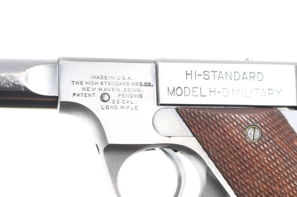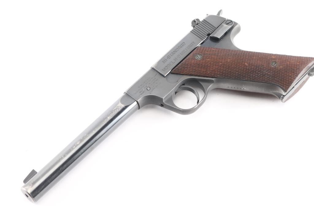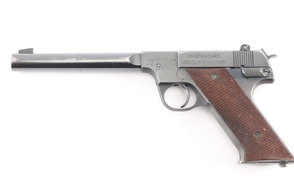Semiautomatic rimfire pistol manufactured circa 1946 - 1955. Features blued finish, checkered walnut grips, 6.75" heavy round barrel with shrouded breech, adjustable sights, manual safety, slide stop lever, heel magazine release, external hammer. Bore is very good condition. Retains 80% blue, some bare metal on edges & corners, along sides of barrel, at muzzle. Tinning and fading to gray on grip straps. Grips are good condition with flattened checker points, small dents. Includes one magazine.