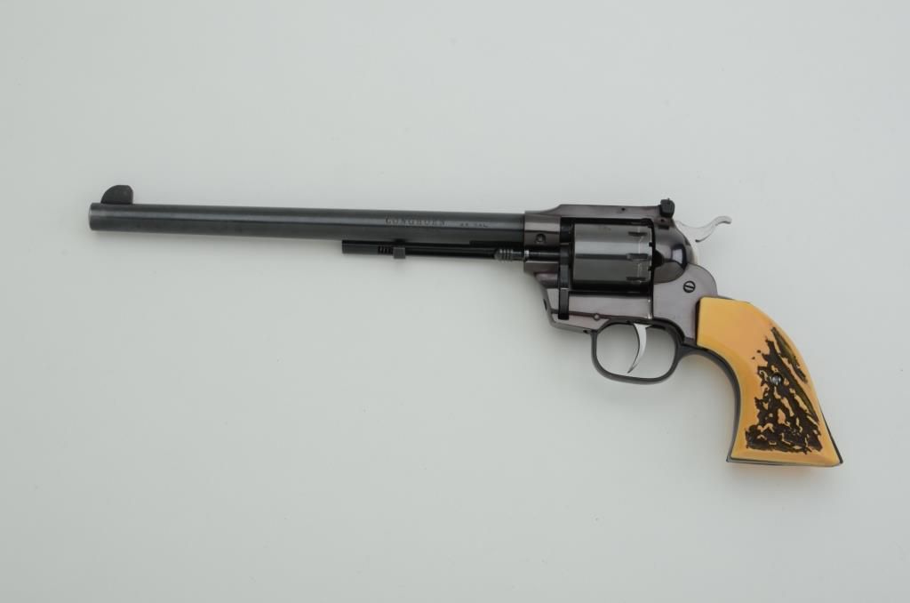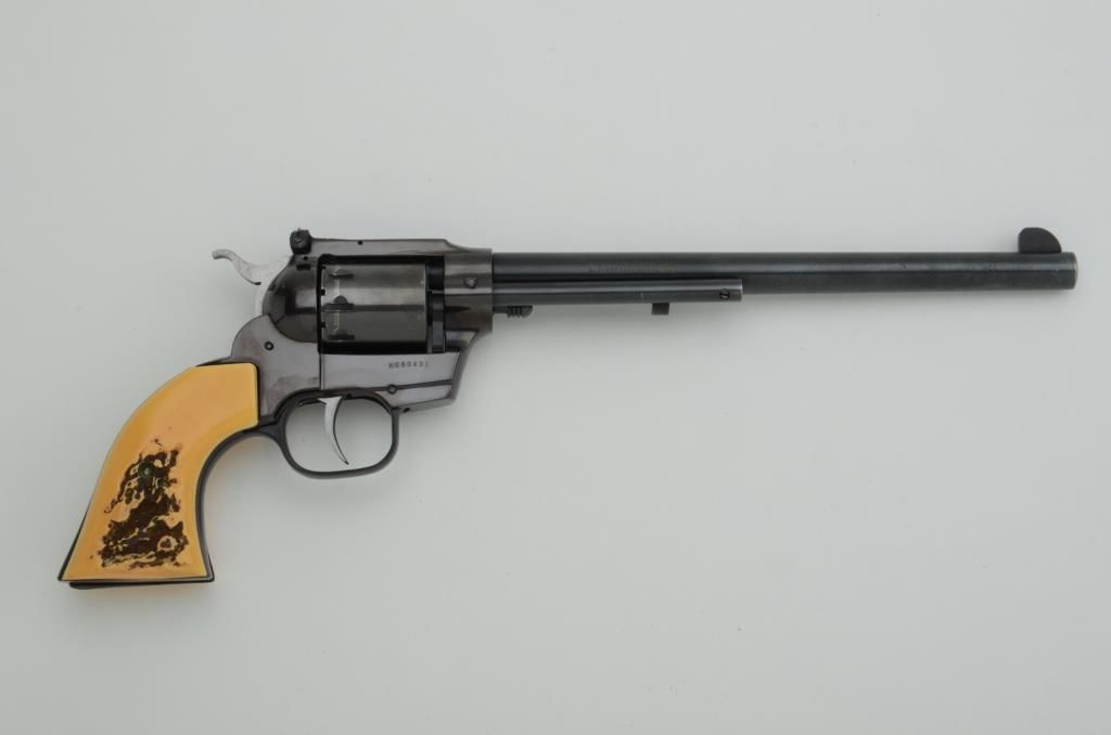 High Standard Longhorn Convertible Model revolver, .22 cal., 9-1/2” barrel, blue finish, faux stag grips, #M080431. This gun is in overall fine to excellent condition showing approx. 98% original finish, finebore, action, markings and grips; swing out cylinder, adjustable rear sight. Est.: $200-$300.