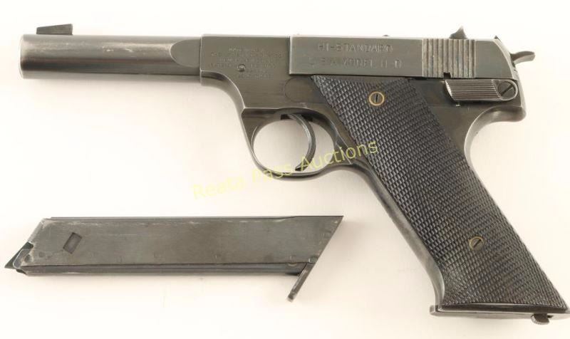 'PROPERTY OF U.S.' Marked single action semi-automatic target pistol chambered in .22 Long Rifle. Features a high polish blued finish, 4.5" heavy barrel stamped "PROPERTY OF U.S.A.", patridge front sight, dovetailed rear window sight, slide hold-open lever, thumb safety, 10 round magazine, "PROPERTY OF U.S." marked frame, serrated trigger, checkered hammer spur and two-piece checkered black plastic grips. Includes a spare magazine and a Smith & Wesson brown leather belt loop holster stamped "EFP 1989." The pistol exhibits approximately 84% of it's original blued finish showing holster wear, light oxidation on the frame and wear on the grip straps. Action is sound, bore is excellent and plastic grips are near fine. Condition is very good+. ***Modern Firearm***