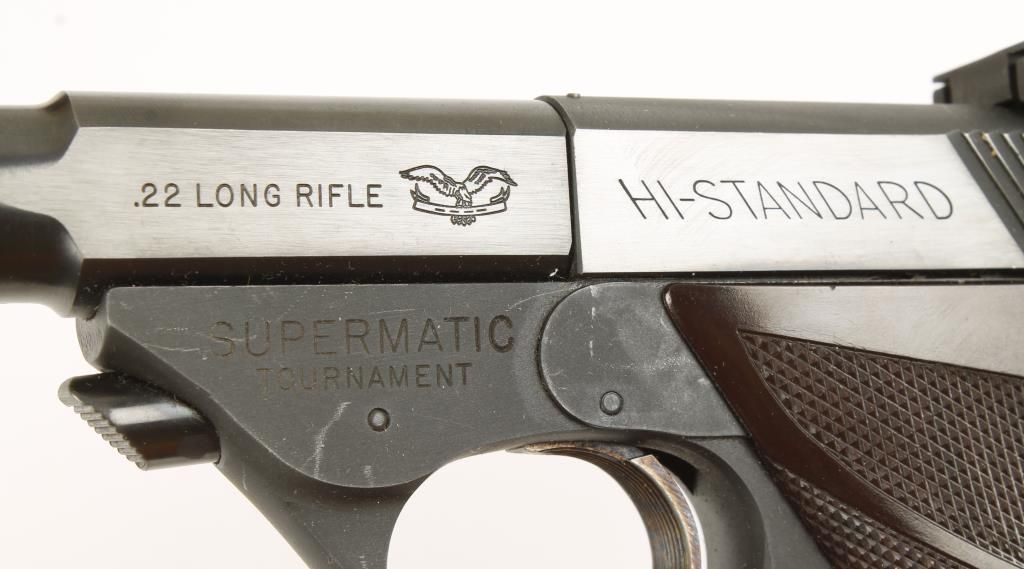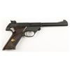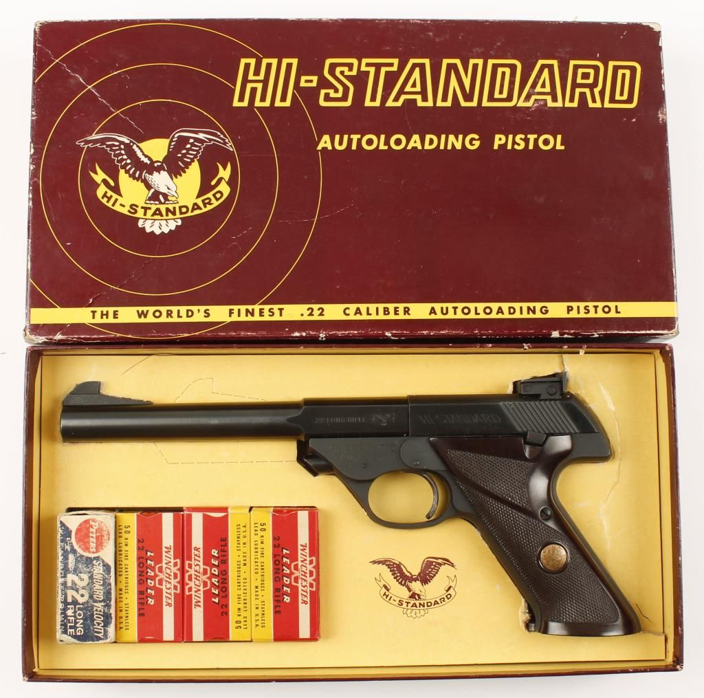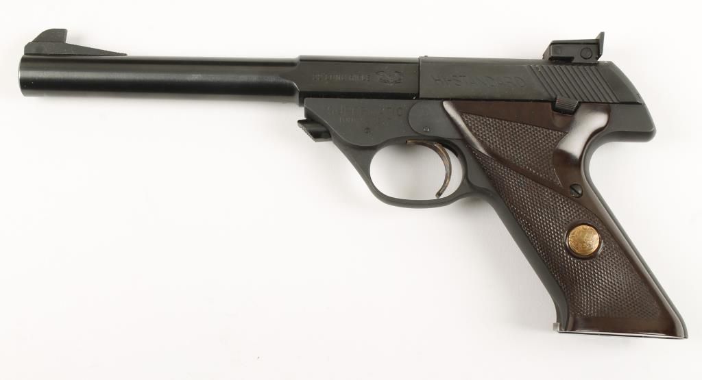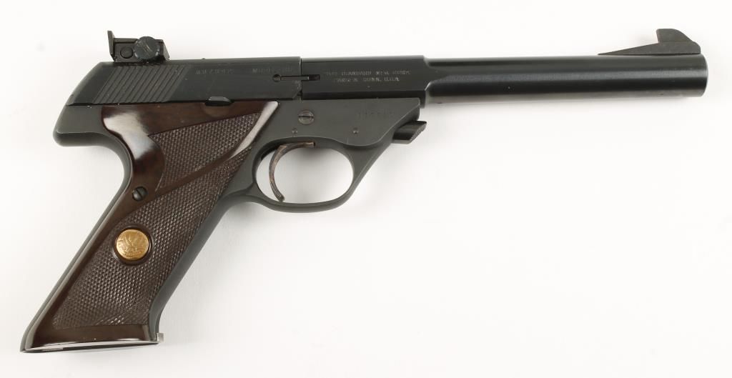 Single action semi auto model 102 rimfire pistol with 6-3/4" barrel. Blued finish, checkered brown plastic grips with gold medallion, case colored trigger and adjustable rear sight. Very good bore and action. Includes original box and 4 boxes of period ammo. Condition: Excellent *Curio & Relic Firearm*