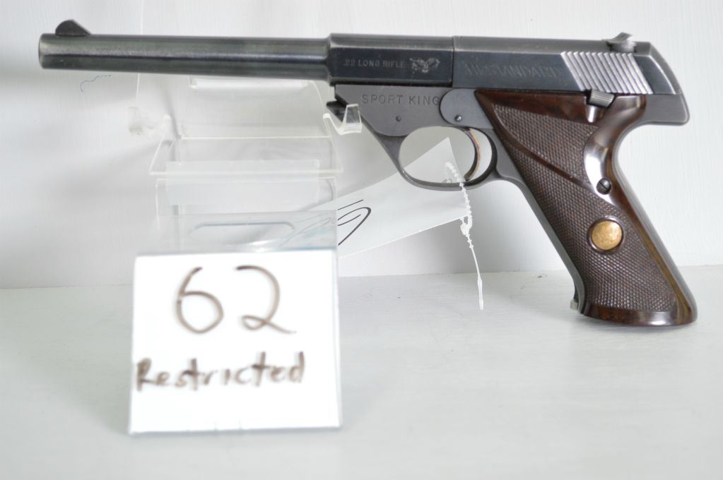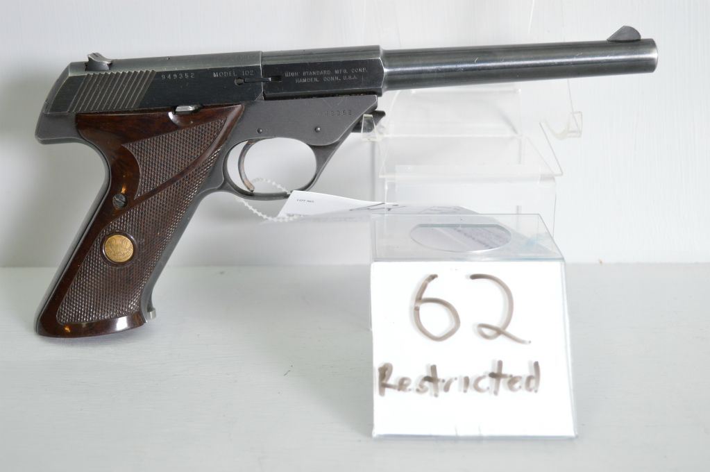 High Standard Mod Sport King Mod 102 .22 LR cal 10 shot Semi Auto Pistol w/ 171 mm bbl [ blued finish starting to fade on front & back strap, slight holster wear, checkered High Standard insignia grips, appears good ] Ser # 949352 Restricted Cert # TCI