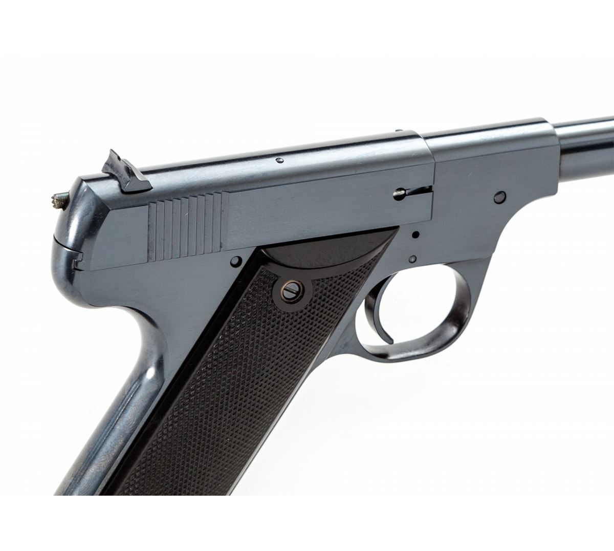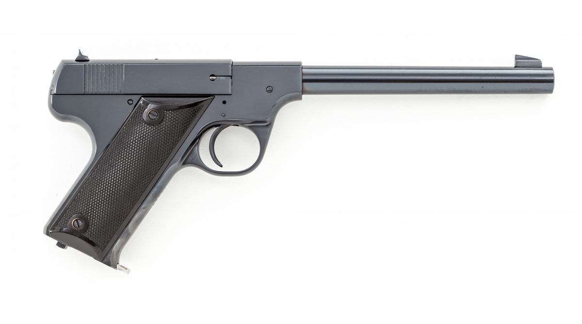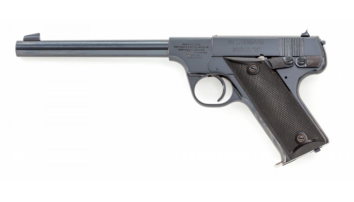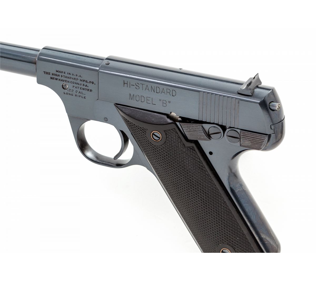 High Standard Model B Semi-Automatic Pistol, #12289, .22 LR cal., 6-3/4'' barrel, blue finish, factory checkered black hard rubber grips, with original instructions. Condition is excellent, appearing as new. Est.: $450-$600. (C&R/PPT)