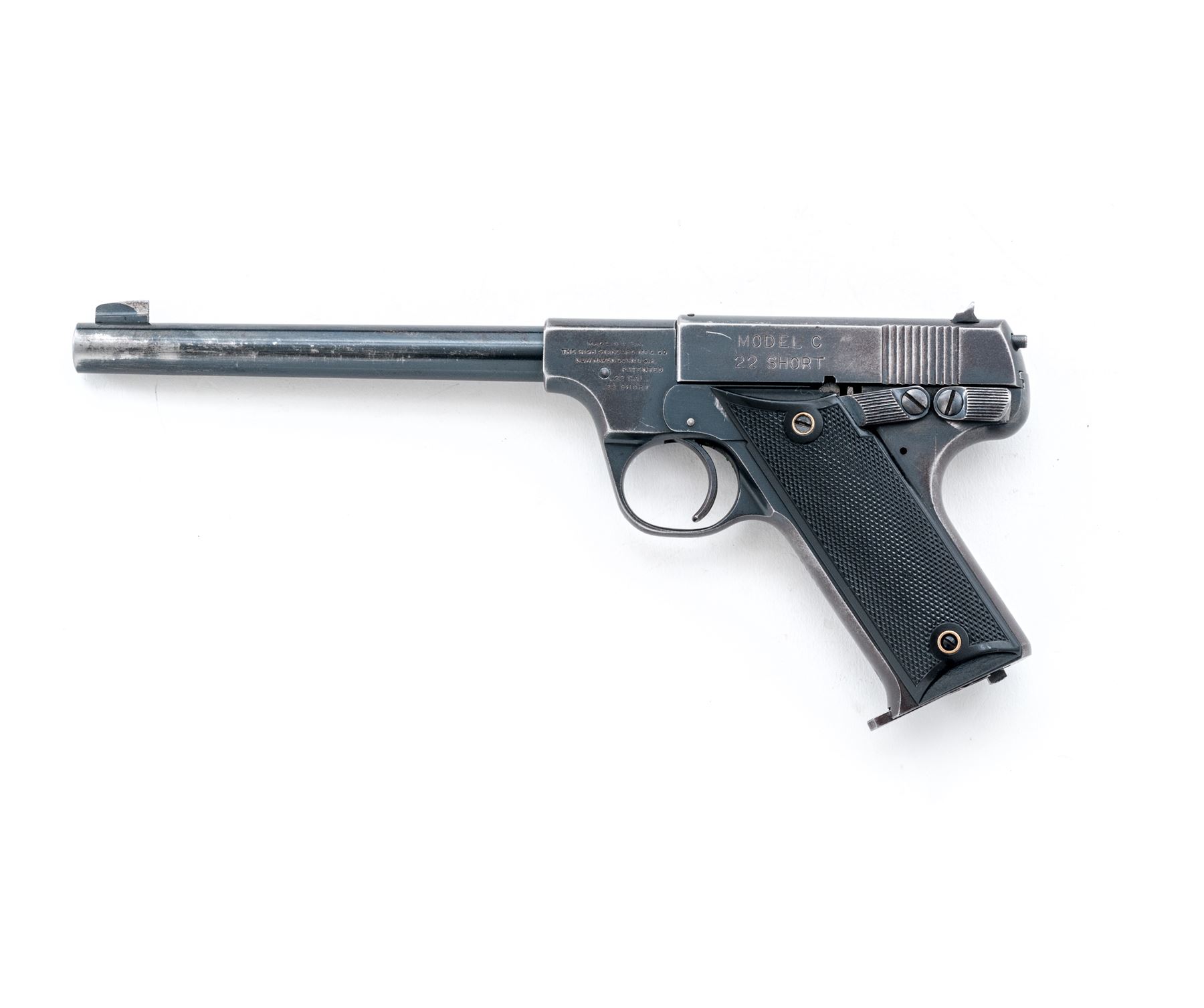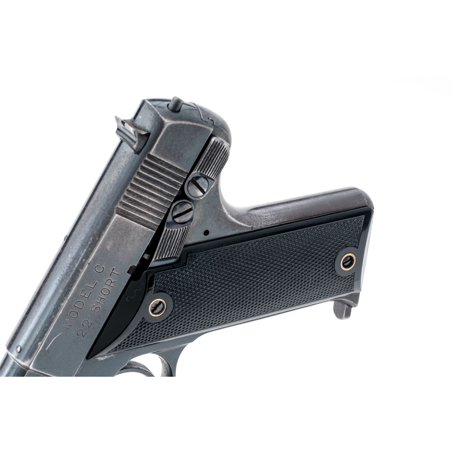 High Standard Model C Semi-Automatic Pistol, #2118, .22 Short cal., 6.75'' barrel, blue finish, Type I-A takedown, checkered black plastic grips, blade front sight and notched rear sight, with one original magazine with steel follower. Mfg'd in New Haven, Conn., ca. 1936-1942. Condition overall is very good, with approx. 70% original thinning and toning blue finish. Metal with specks of reddish brown freckling, mainly on the frame and slide. Factory lettering is clear. Left grip is near excellent for its age, showing very little wear; upper corner of right grip is cracked at the retaining screw, checks are nice and clean. Back of rear sight has been lightly tapered. Very good smooth action; bore is ringed approx. 1'' down from the muzzle but is otherwise bright and clean with nice rifling. Est.: $250-$450. (C&R)