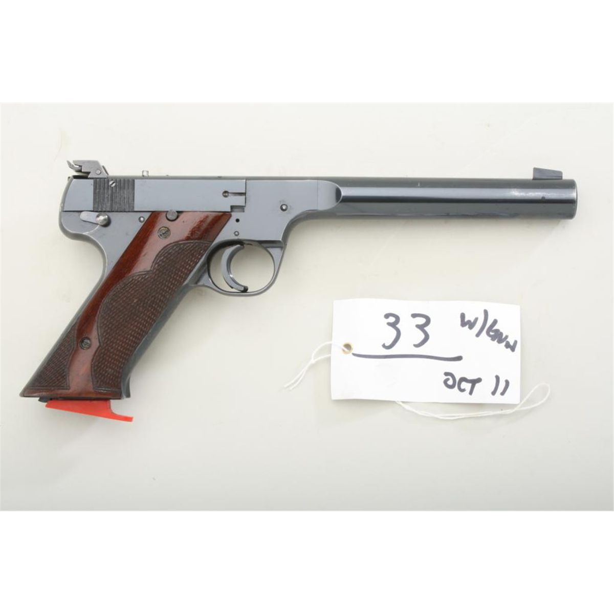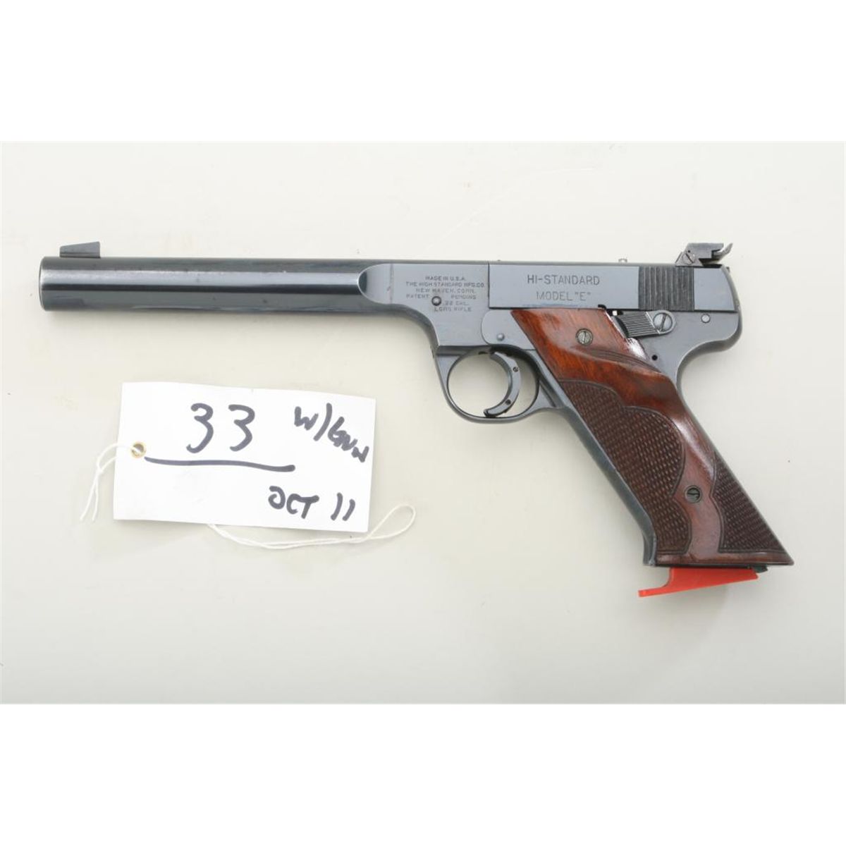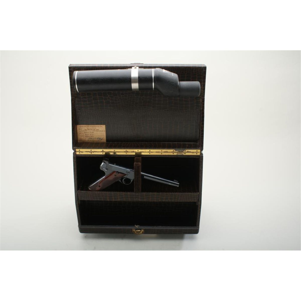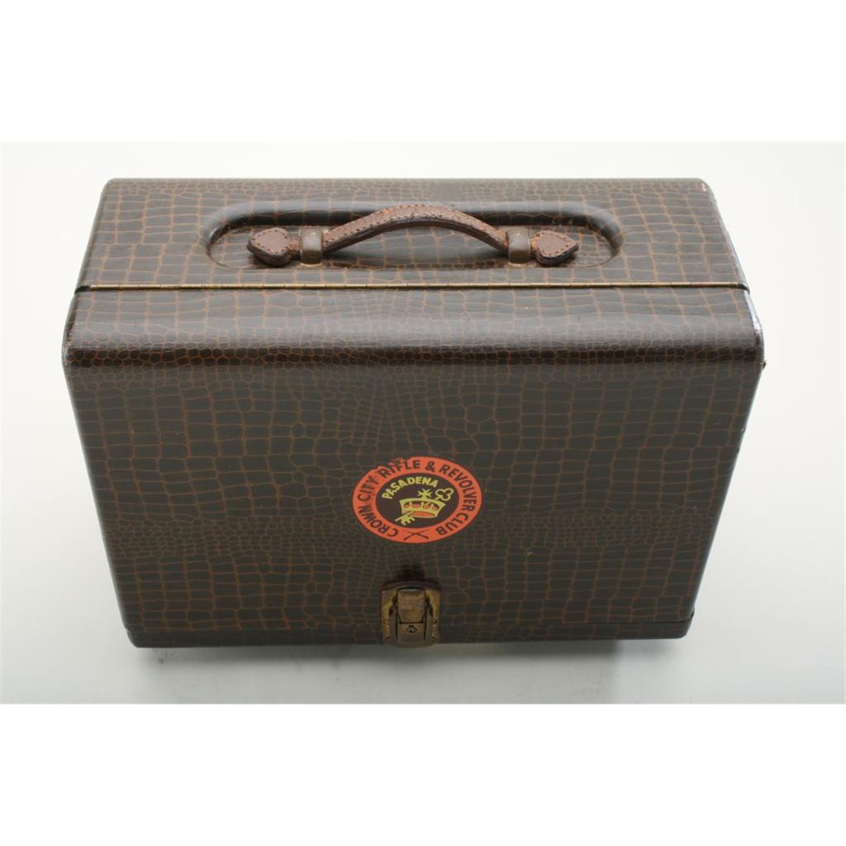 High Standard Model E semi-auto target pistol with shooting case and Argus Super Grade spotting scope, .22LR cal., 6-3/4” heavy barrel, blue finish, checkered target thumb rest grips, two extra magazines, #55061. This gun is in overall excellent condition showing approx. 95% original finish, fine bore, crisp action, sharp markings, adjustable rear sight, trigger shoe added, fine grips with a couple mars from storage;accompanied by a shooting case with Argus spotting scope that displays good optics; inside the case is a membership card to the Crown City Rifle & Revolver Club of Pasadena, CA in the name of legendary Southland gundealer Mahlon Frank who competed in the 1932 LA Olympics; the case is in overall very good condition with faux alligator skin design leather covering. Est.: $800-$1,200.