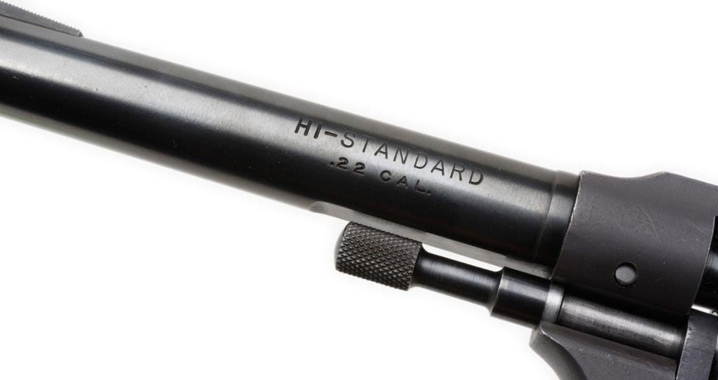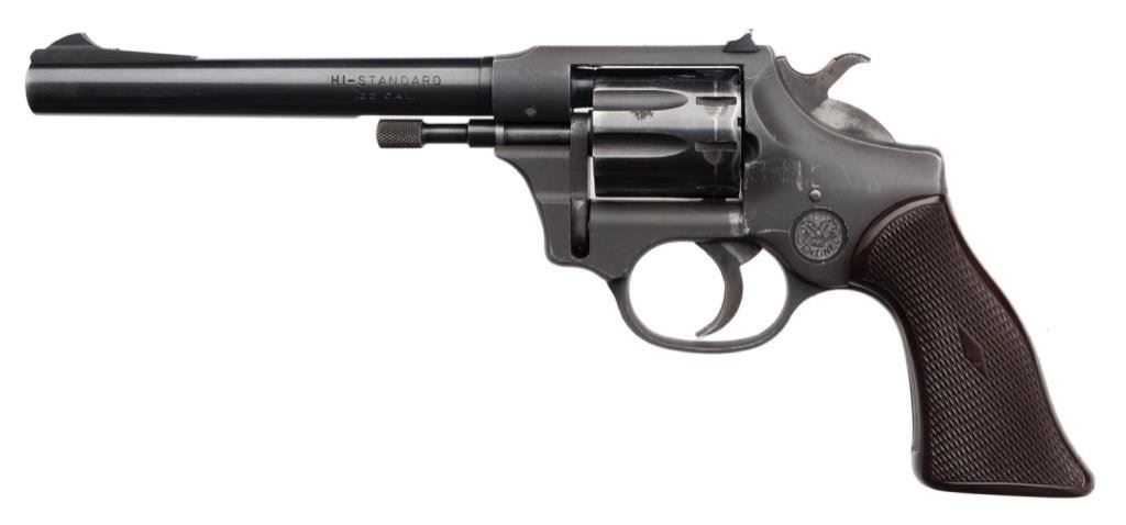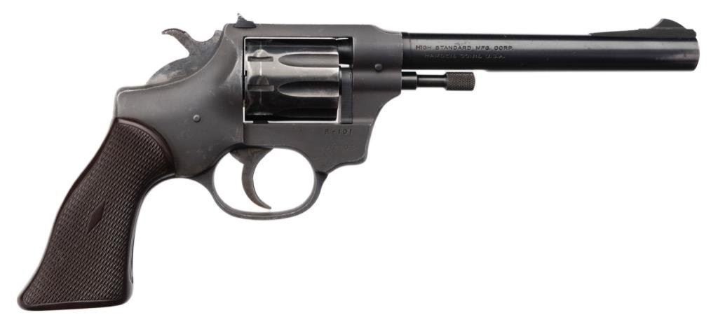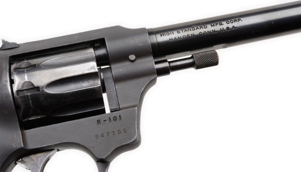 *High Standard Model R-101 DA revolver, .22 caliber, 6” barrel, S/N 947705, black finish, checkered plastic grips in overall very good condition with some scattered holster wear, good bore, action and grips. Est.: $100-$200.