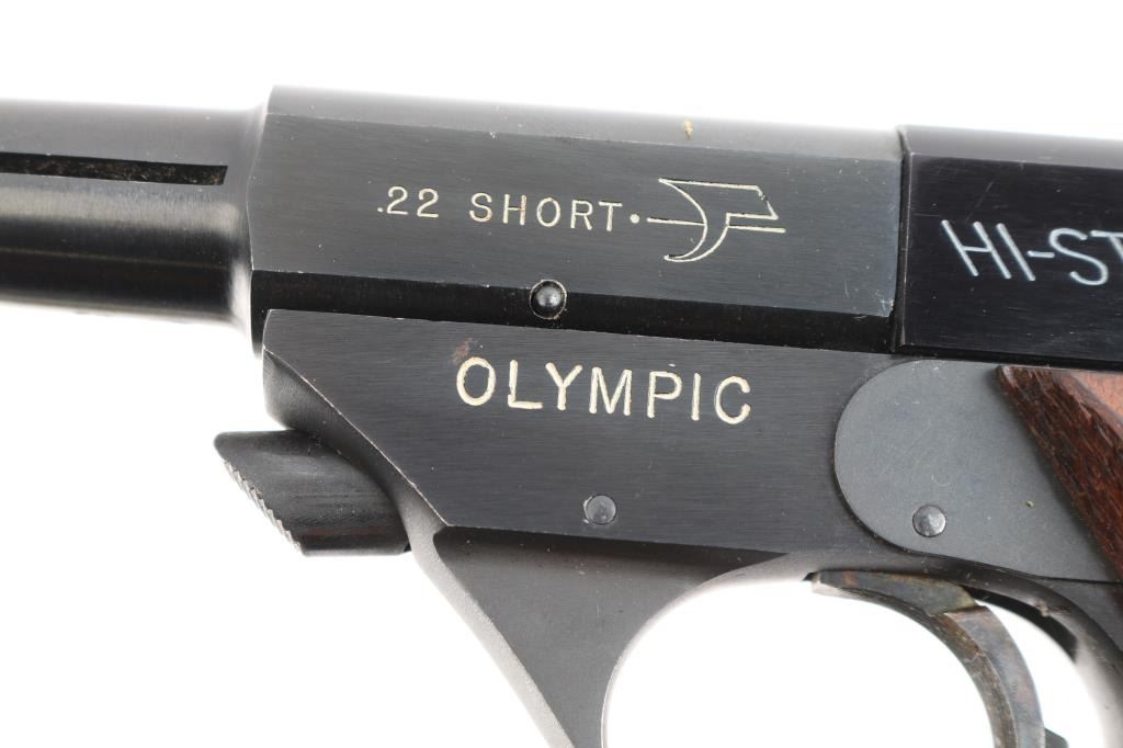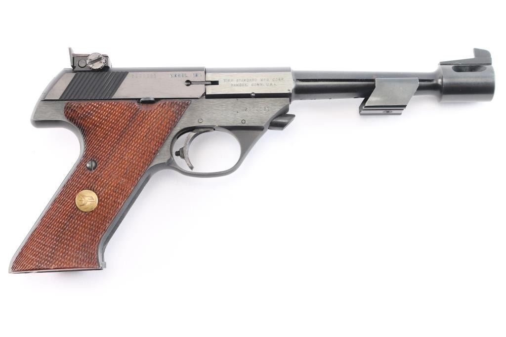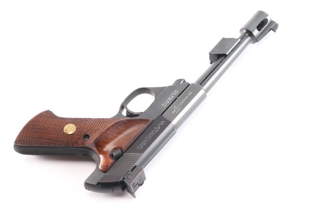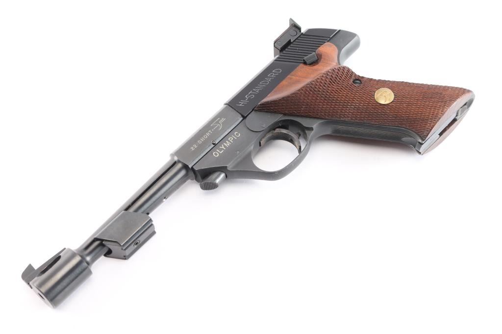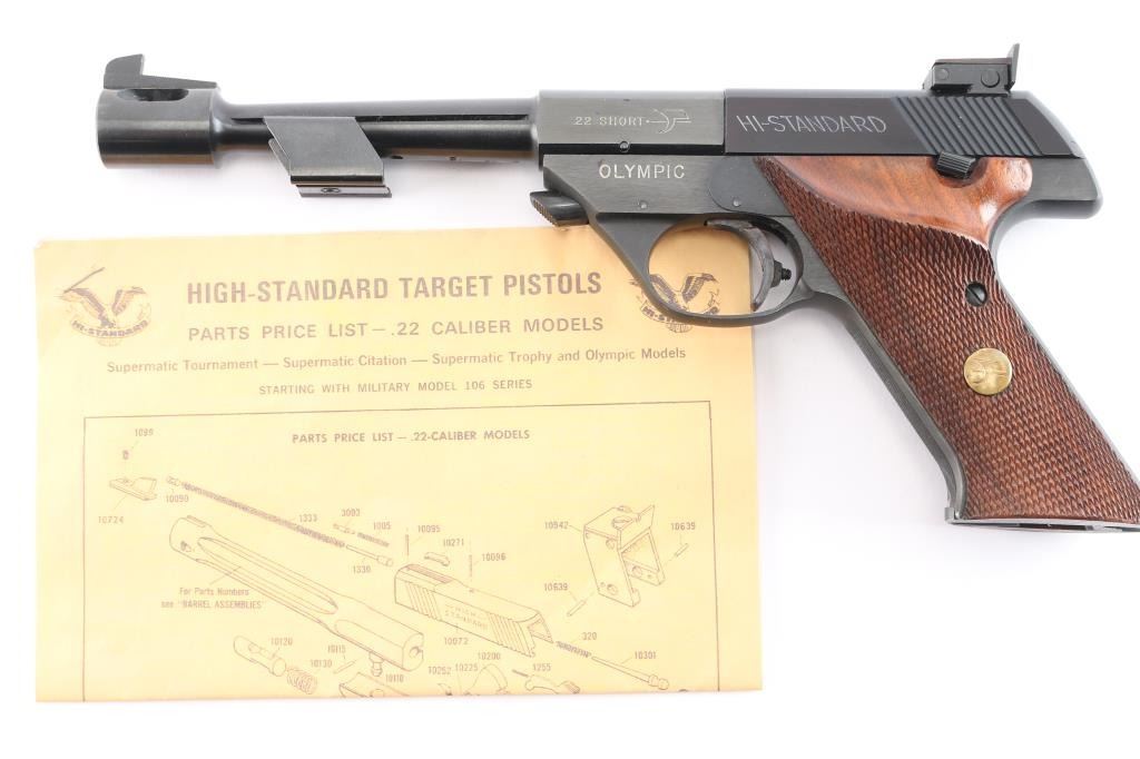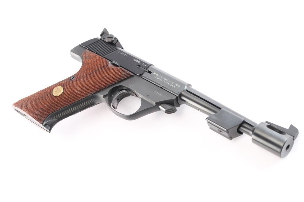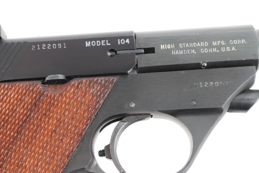 'Model 104,' an American made vintage blowback-operated single-action semi-automatic target pistol chambered in .22 Short, manufactured circa 1949-1950 in Hamden, CT. Known as the 'First Model Olympic,' it is a deluxe top of the line target pistol that is an adaption of the Model GE for .22 Short. Pistol features a polished blued finish, a 6-3/4" tapered barrel with an integral muzzle brake, barrel drilled and tapped for barrel weights, ramped fixed partridge front sight, Davis micrometer adjustable rear sight, serrated take-down push-button, serrated slide stop on right side of the frame, left side frame mounted serrated color manual safety, serrated grip straps, serrated heel magazine release, serrated color-case curved trigger with adjustable stop, and two-piece checkered hardwood with right hand thumb rest and brass Hi-Standard medallions. The pistol markings are color filled, and are sharp and legible. The original blued finish retained is approximately 98% with very light scattered scratches. Metal displays no deformation, but there are a few very small spots of rust observed on the frame, and right side of the barrel by the chamber. The action is smooth and crisp, and the wood grips are excellent. Bore is bright with strong rifling. Pistol includes manual, paperwork, and an attached barrel weight. This pistol would be excellent without the observed rust.