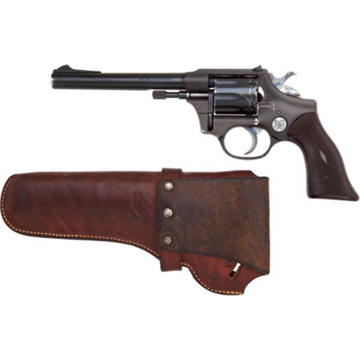 High Standard Sentinel Double Action Revolver. Serial no. 830027, .22 caliber, 6-inch barrel. Steel frame, blued finish, fixed sights. Case-hardened hammer and trigger. 9-shot cylinder. Checkered brown plastic grips. Sold together with brown leather hunter holster.Condition: Very good. Light muzzle wear. Tracking line to cylinder and scratches on frame from ejector star. Holster good but missing top strap. Age wear and verdigris deposits. Bright bore with light wear. Action good.NRA FIREARMS FOR FREEDOM PROGRAM