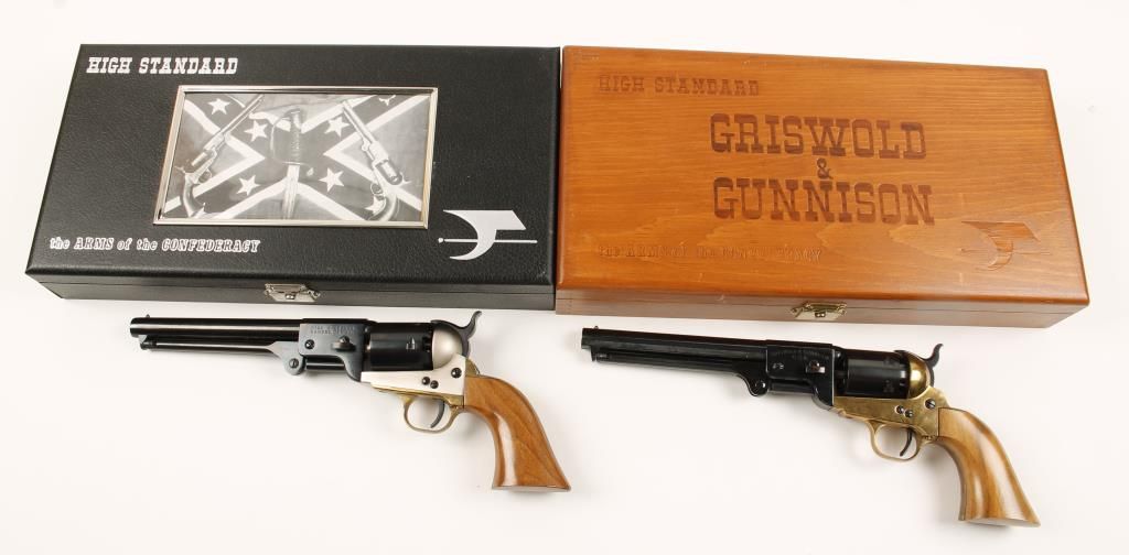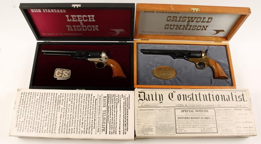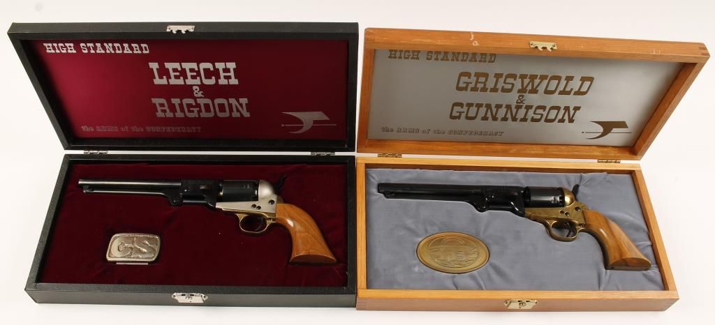 Set of two separately cased same serial numbered replica black powder single action 6-shot pistols. From the "Arms of the Confederacy" series. One is Leech & Rigdon and the other is Griswold & Gunnison. Blued 7-1/2" barrels, loading levers and cylinders. L&R has a matte steel frame and the G&G has a brass frame. Both have brass trigger guards and back straps. Neither is cut for a shoulder stock. Each comes in its own lockable velvet lined case. One is hardwood and one is wrapped with a leather textured material. Includes the original packaging with sleeves and documents. Condition is Like new in box.. *Antique Firearm*