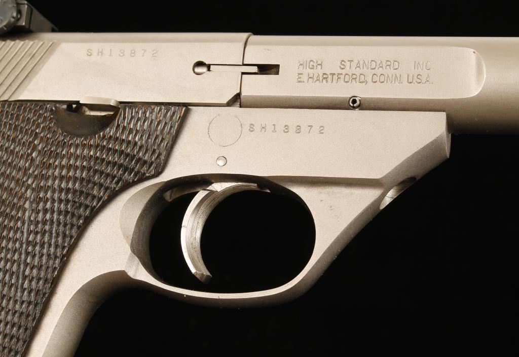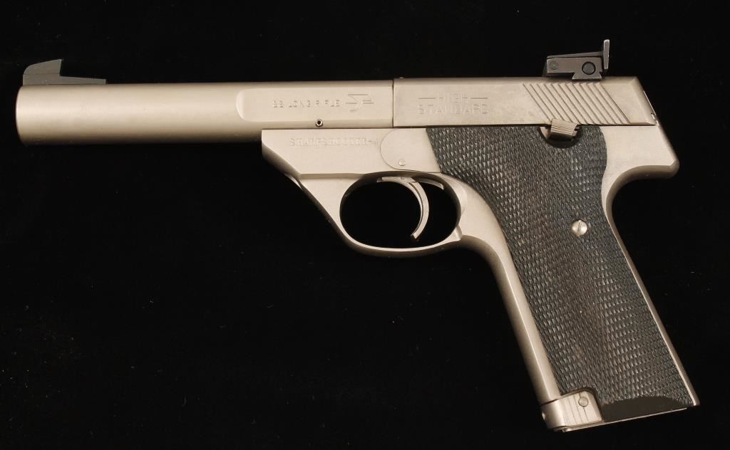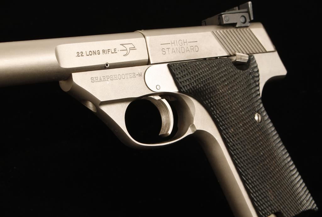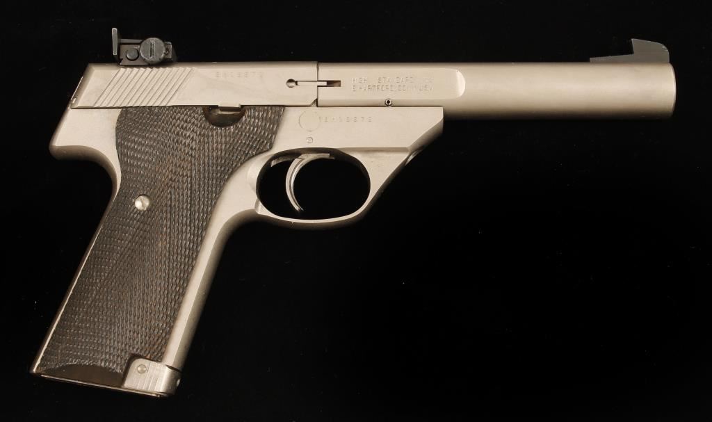 Satin stainless single-action semi-automatic pistol with a 5-1/2" bull barrel, adjustable rear sight, Patridge front sight, wide serrated trigger, checkered plastic grips and one 10-round magazine. Metal finish has a few rubs and dings. Bore is immaculate with strong rifling. Action works well. Condition is very good. *Modern Firearm*