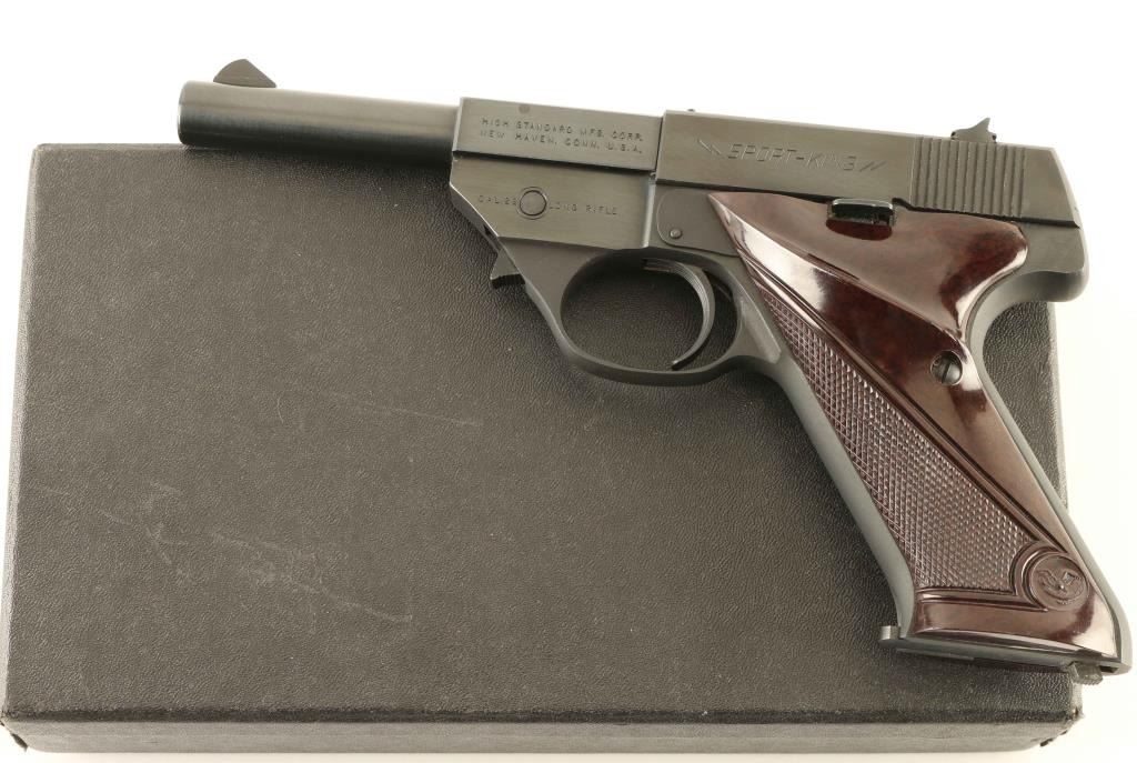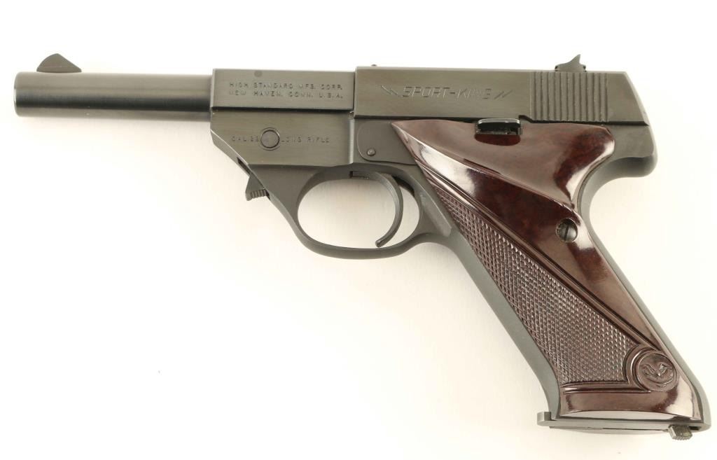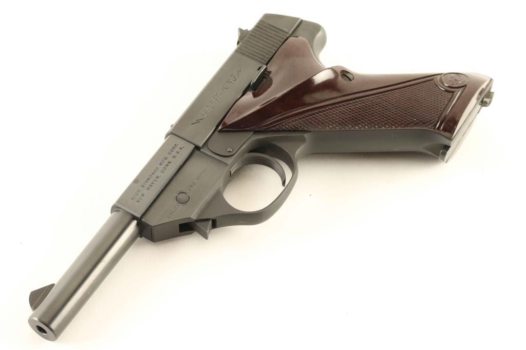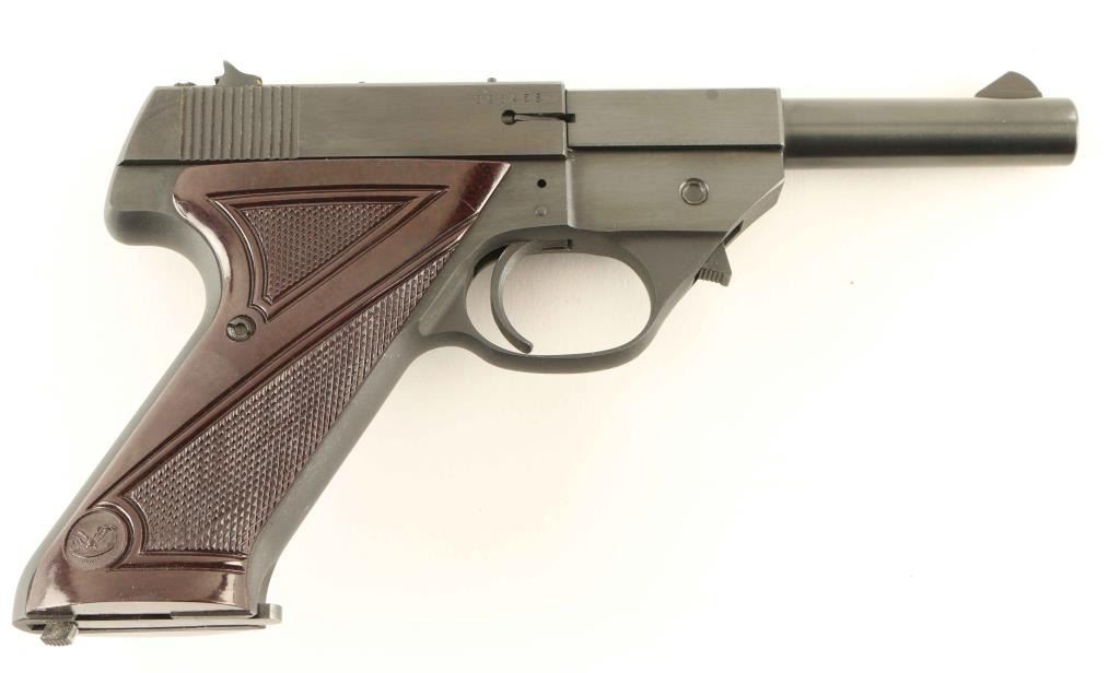 'Lever Series' Vintage single action semi-automatic target pistol chambered in .22 Long Rifle, manufactured circa 1951-1953. Features a matte & polished blued finish, 4 1/2" barrel with lever release, serrated ramp front sight, dovetailed rear sight with square notch, serrated trigger, concealed hammer, thumb safety on the left side of the frame, no slide catch, heel magazine release, 10 round magazine, steel frame and two-piece checkered faux wood synthetic thumb rest grips. Includes the original factory black leatherette covered cardboard box with documents. Pistol exhibits approximately 99%+ of it's original blued finish showing very little wear with only a few light handling marks observed. Action is smooth, the bore appears excellent but has specs of debris or possibly rust, and the plastic grips are very good with a few small losses. Condition is NRA Excellent in box. ***Modern Firearm***