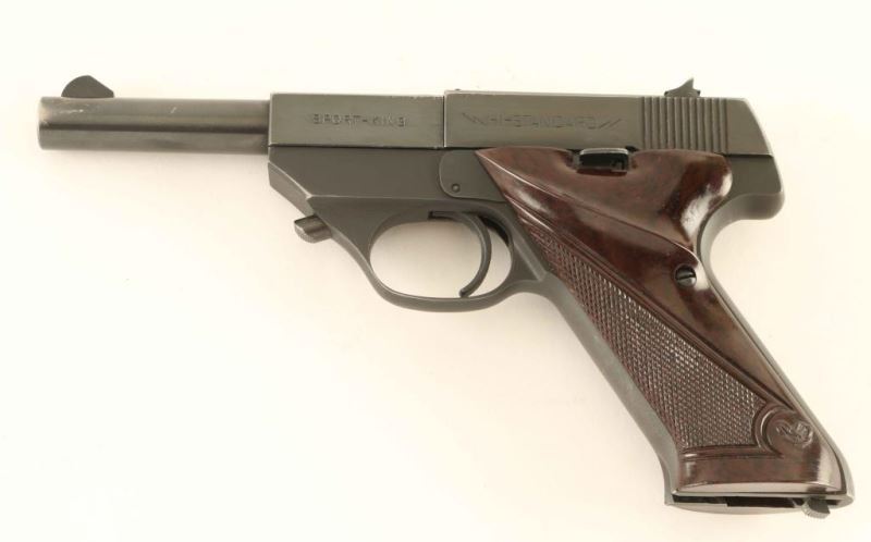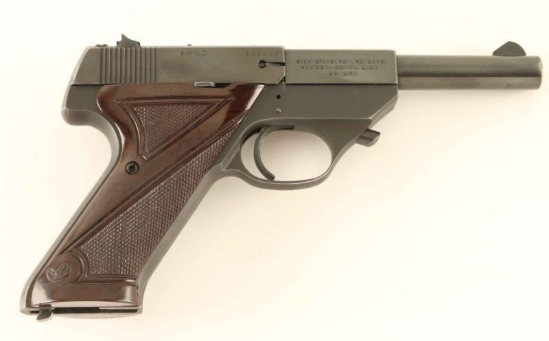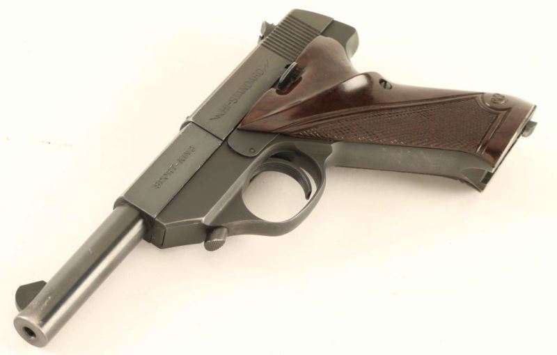 Semi automatic 22 long rifle pistol with blued finish with a 4 1/2" barrel. Finish shows light scattered pitting. Fixed sights with plastic grips and no magazine. NRA Good ***Modern Firearm***