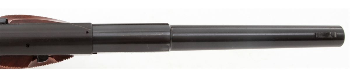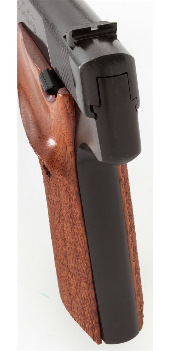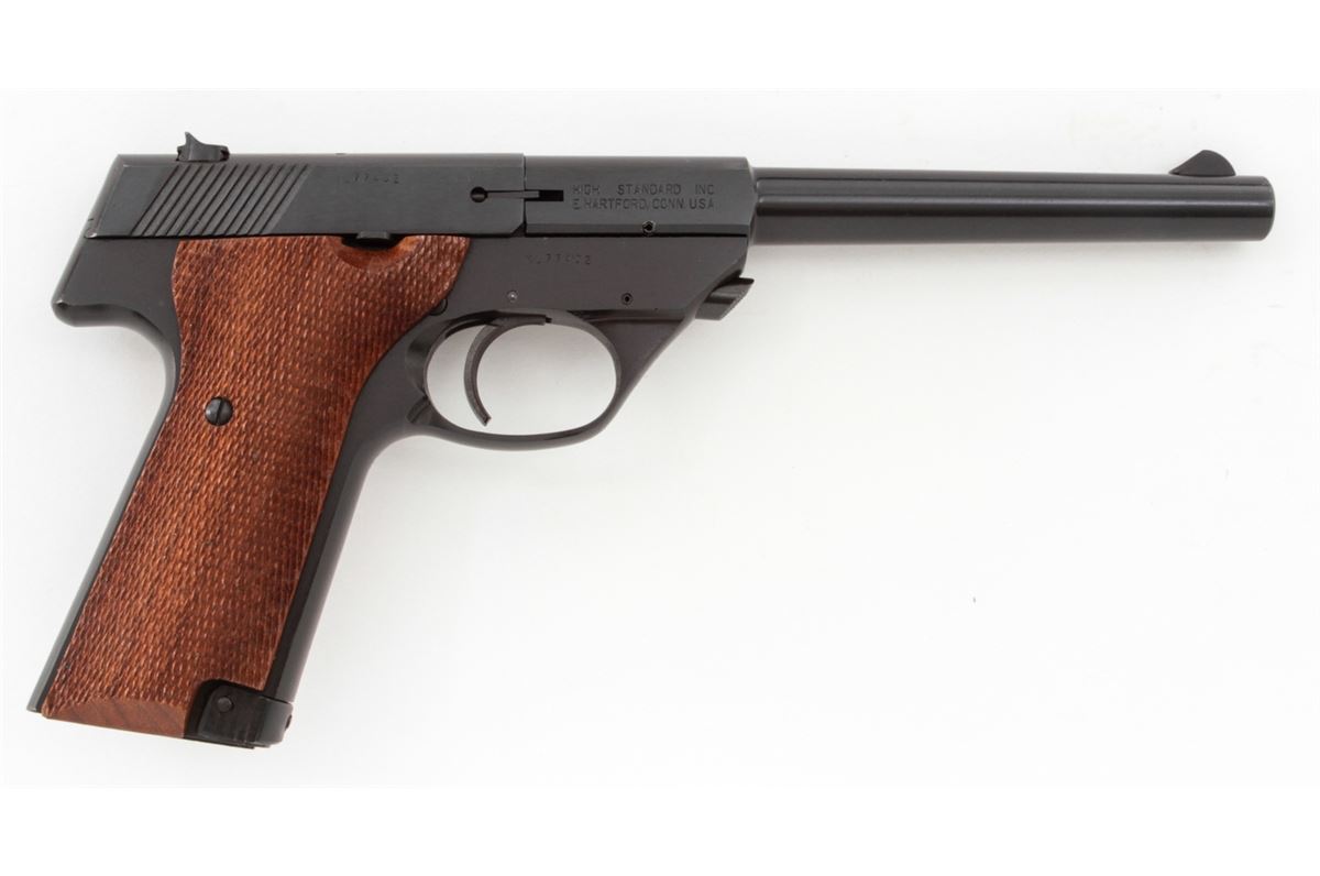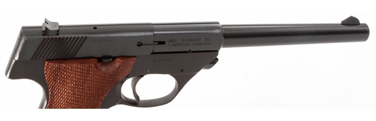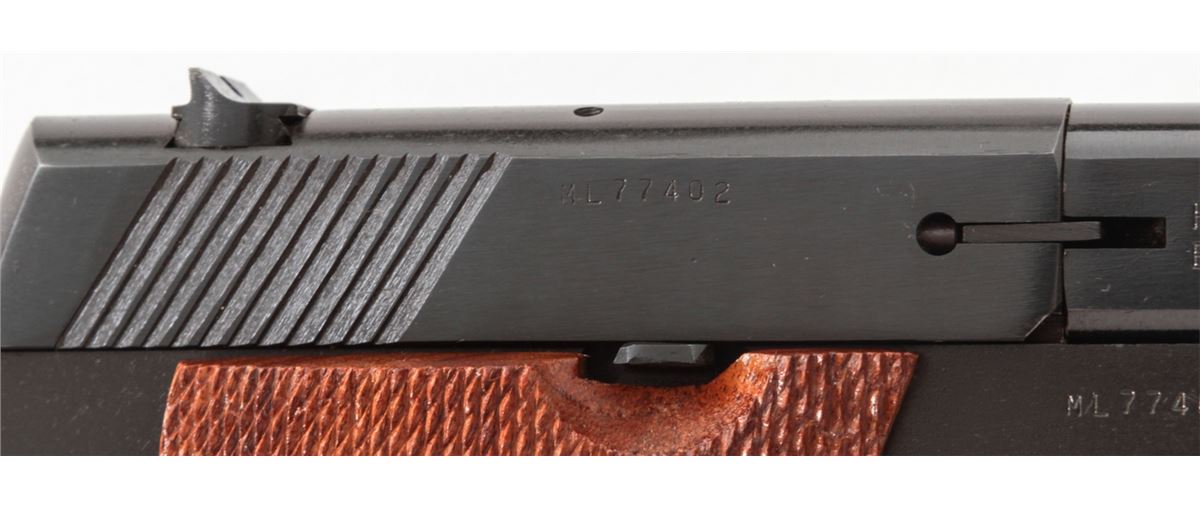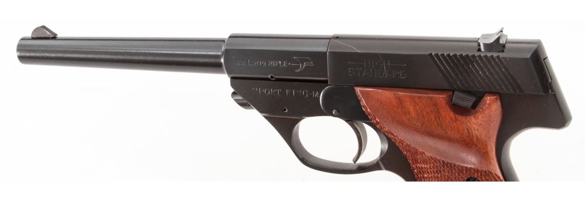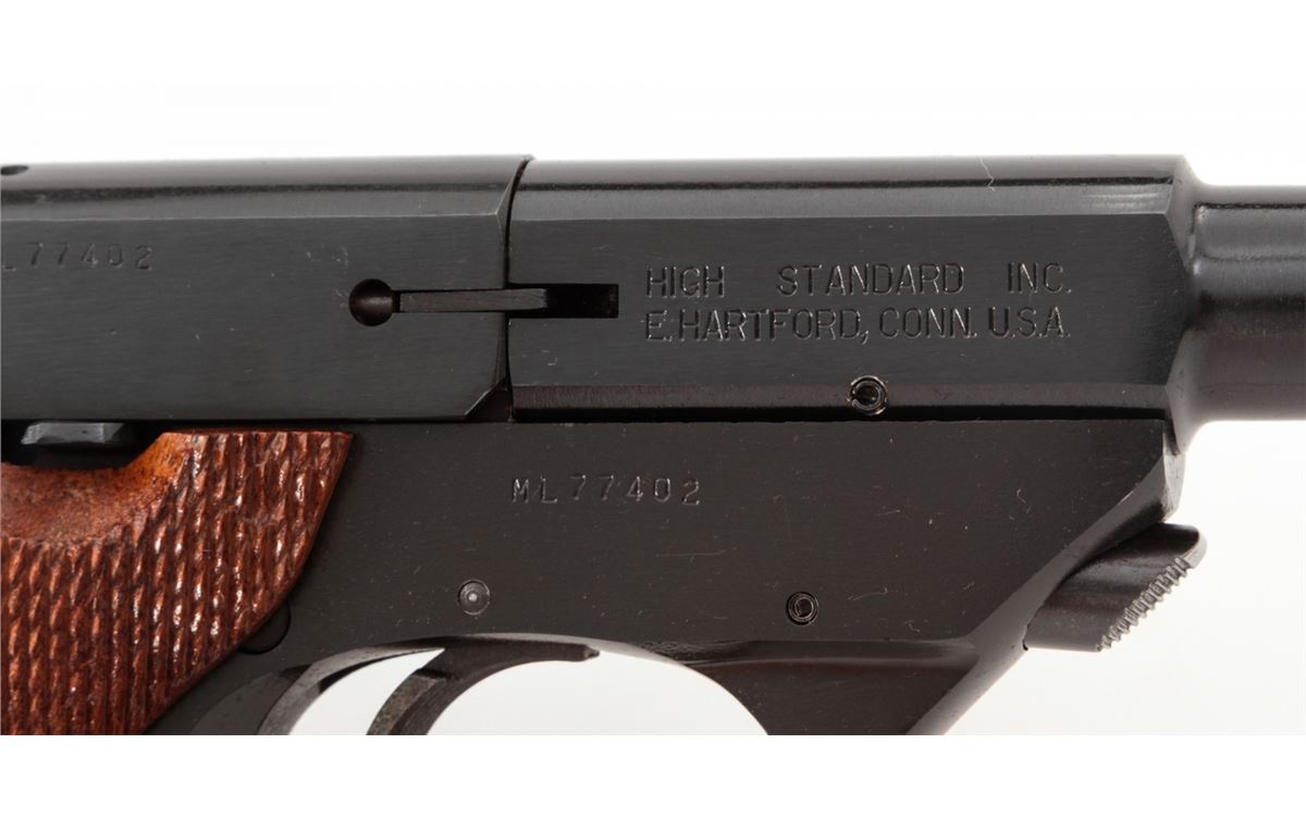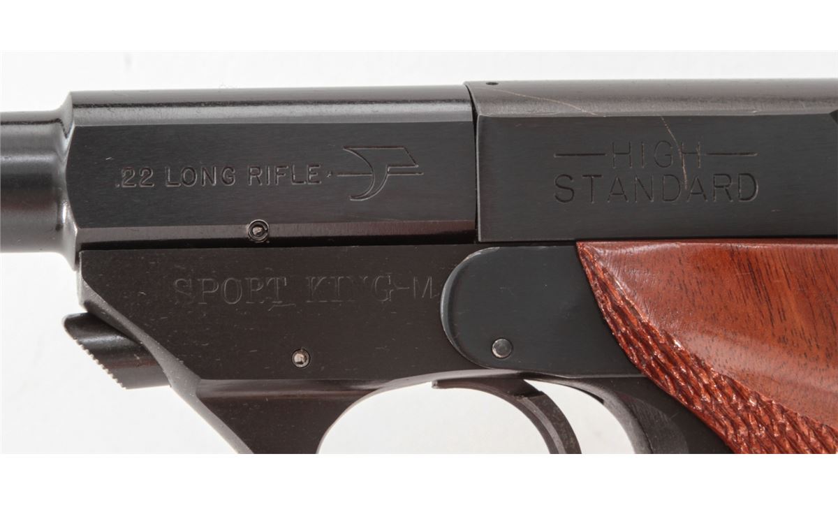 High Standard Sport King-M Semi-Automatic Target Pistol, #ML77402, .22 LR cal., 6.75'' barrel, blue finish, factory checkered walnut grips, with one factory magazine. Condition is fine with an approx. 3'' long scratch along top of barrel and slide, otherwise as new. Est.: $350-$500. (Modern/PPT)
