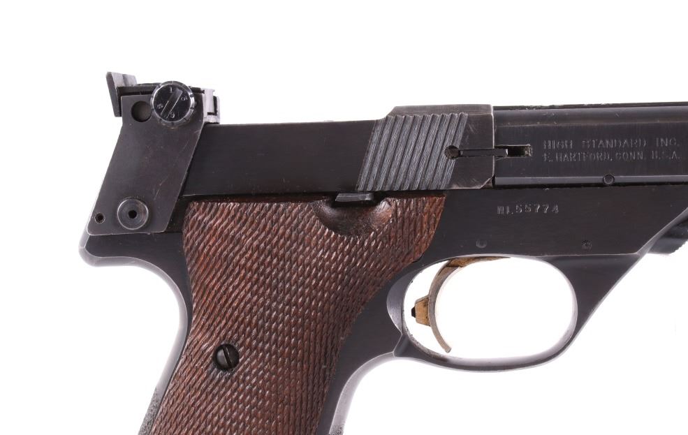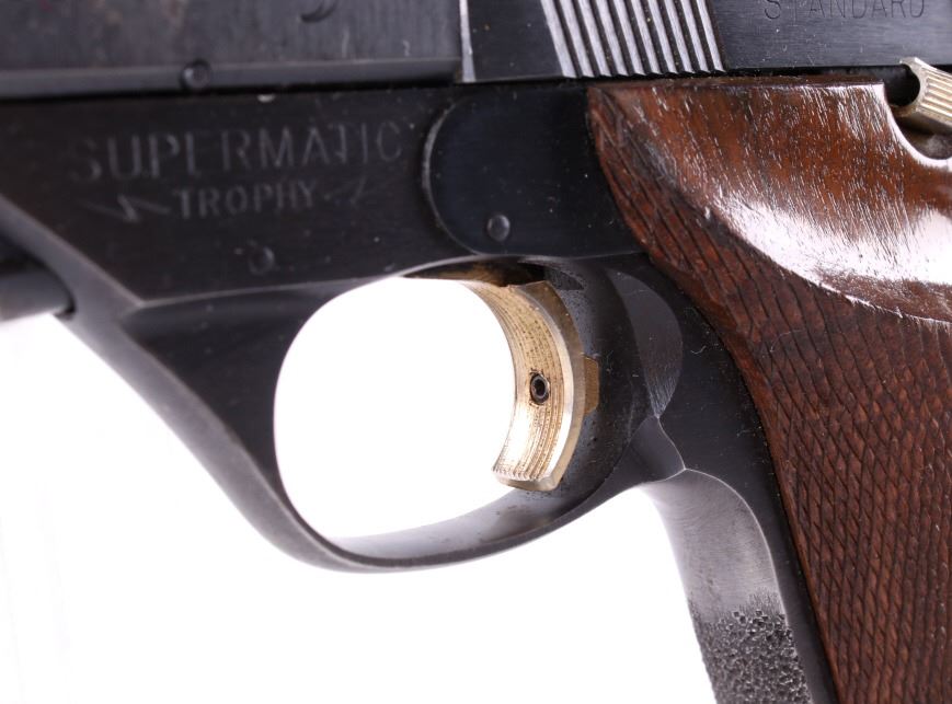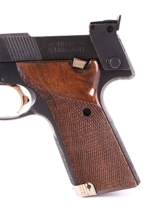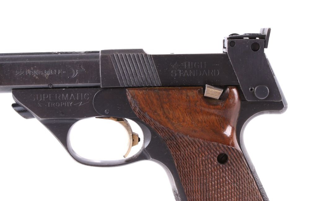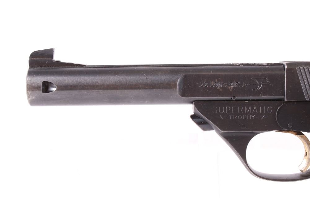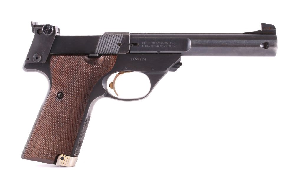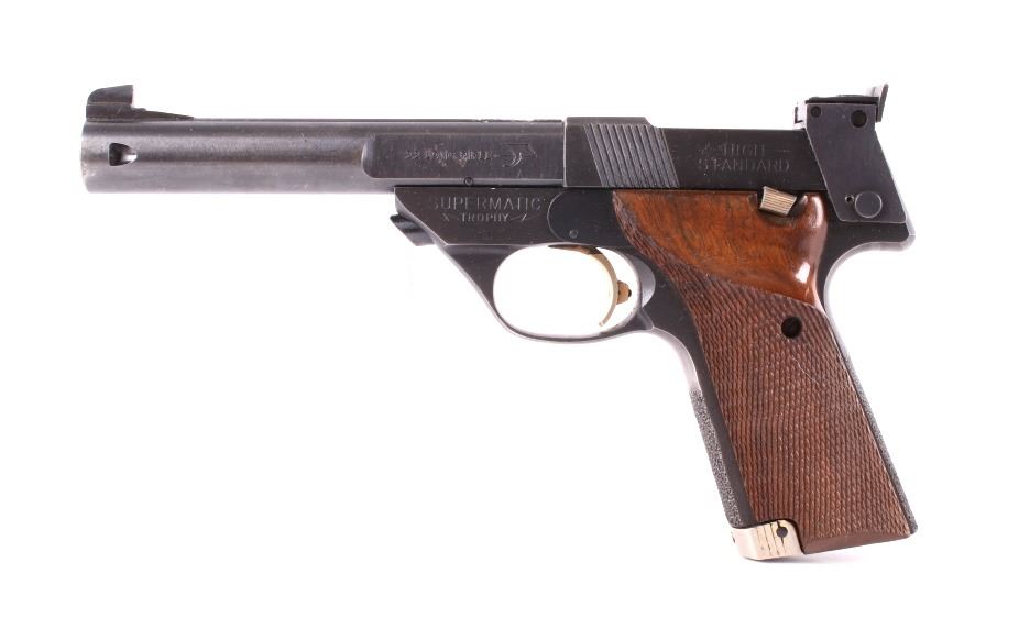 For your consideration is a nice High Standard Supermatic Trophy semi auto pistol in 22LR, with a 5 1/2" barrel that does remove with the press of a button, & has one 10 round magazine, nice checkered straight grain walnut hardwood grips with thumb rest, gold plated trigger, magazine release & safety. The barrel is marked on the left “.22 Long Rifle – High Standard – Supermatic Trophy”. The pistol shows good overall condition with light dings associated with use. Serial Number: ML55774. This is a modern firearm and requires a FFL transfer or NICS background check. Matt