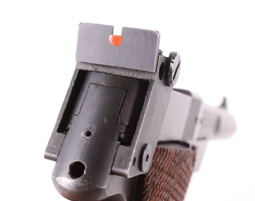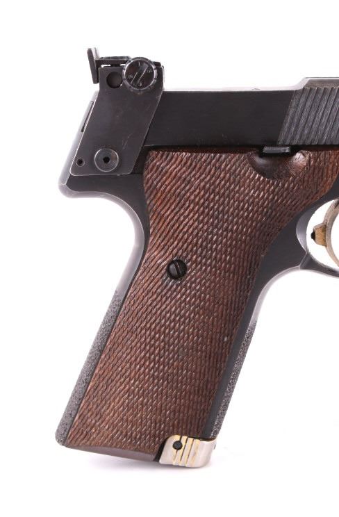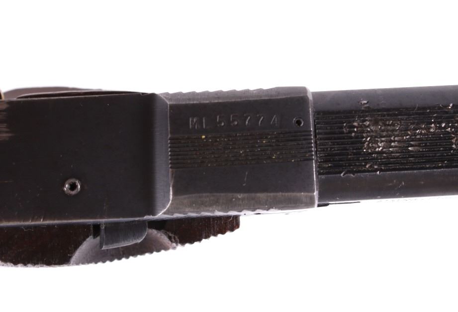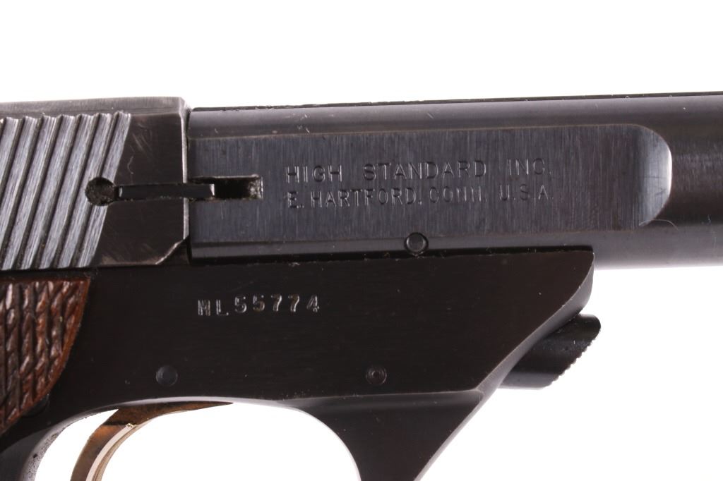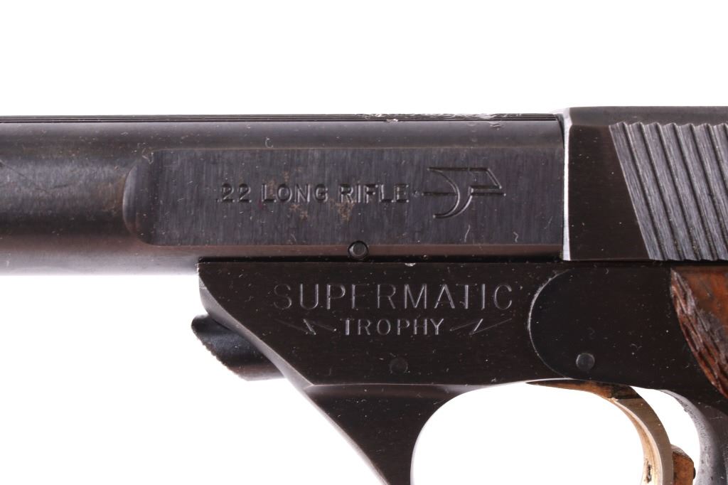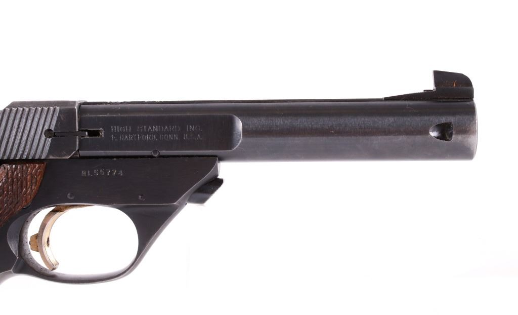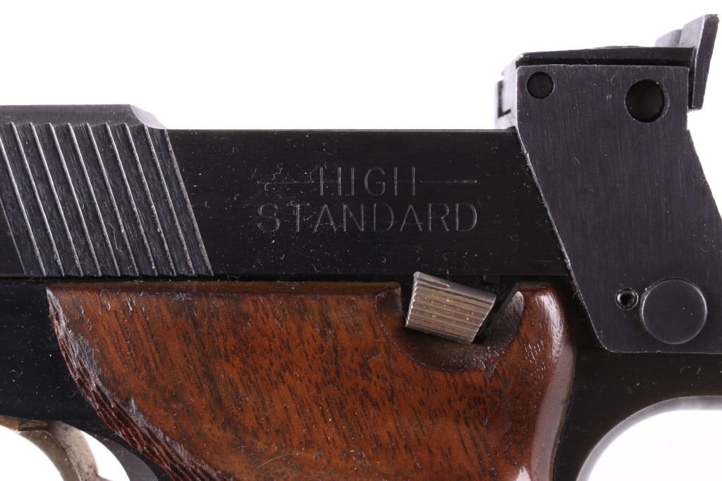 For your consideration is a nice High Standard Supermatic Trophy semi auto pistol in 22LR, with a 5 1/2" barrel that does remove with the press of a button, & has one 10 round magazine, nice checkered straight grain walnut hardwood grips with thumb rest, gold plated trigger, magazine release & safety. The barrel is marked on the left “.22 Long Rifle – High Standard – Supermatic Trophy”. The pistol shows good overall condition with light dings associated with use. Serial Number: ML55774. This is a modern firearm and requires a FFL transfer or NICS background check. Matt