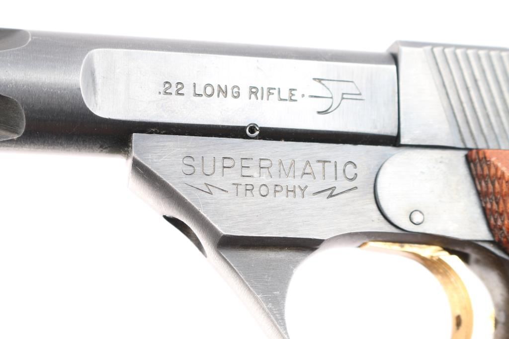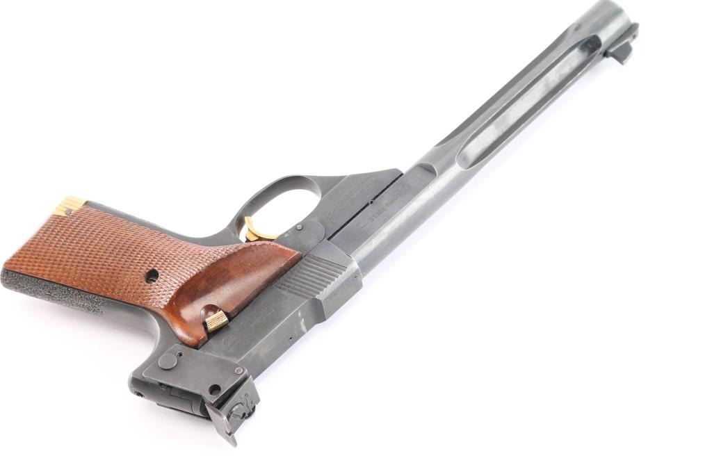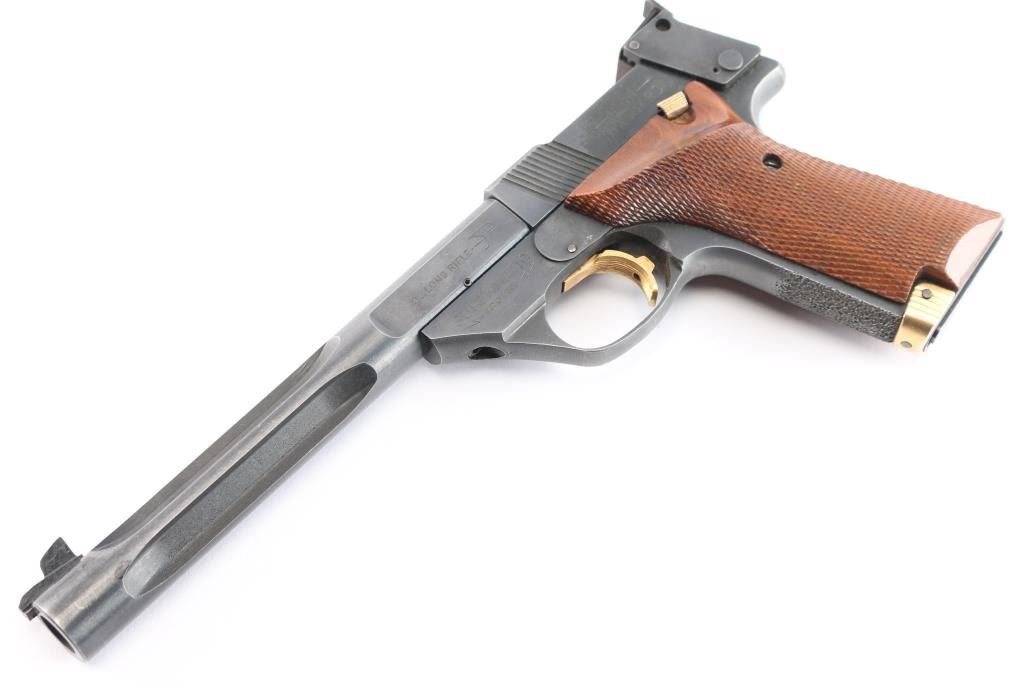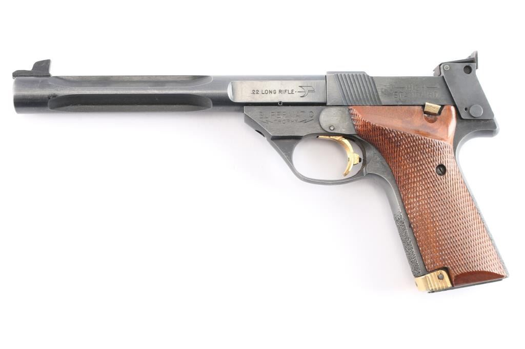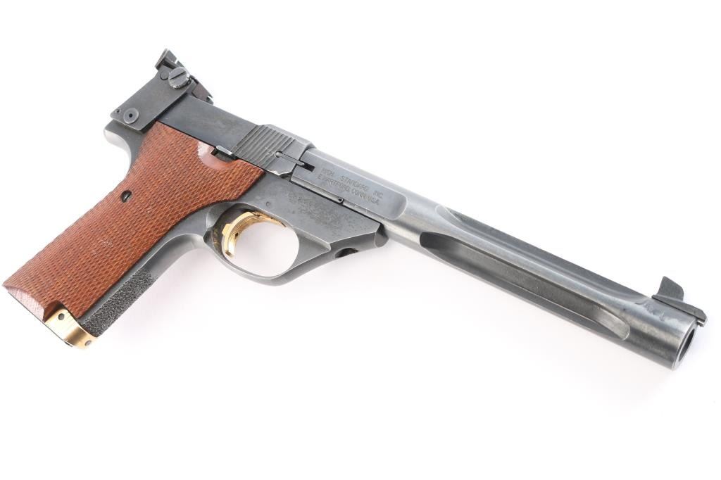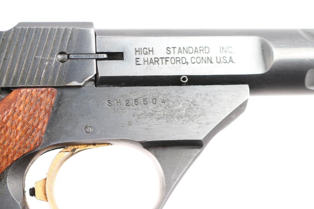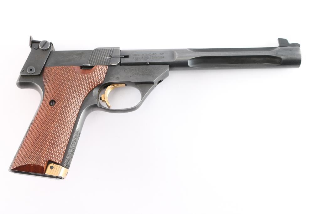 Semiautomatic rimfire pistol chambered in .22 Long Rifle manufactured circa 1982 in East Hartford, CT. This is an SH series pistol, the final series that High standard produced. It differs from the 107 series with a new screw barrel release rather than using a push button. Featuring a blued finish, stippled grip straps, checkered wood grips with right hand thumb rest, 7.25" fluted barrel with recessed crown, serrated curved trigger with adjustable stop, partridge front sight, frame mounted adjustable rear sight, toe magazine release, and manual safety. Trigger, magazine release, and safety are finished with a gold tone. Bore is bright with strong rifling. The pistol retains approximately 90% of its blued finish with edge wear, fading, and minor scratches. The front of the barrel looks like it was painted. The front sight is not fully seated into its dovetail. Grips are very good to excellent condition. The slide is numbered to frame, and includes one magazine.