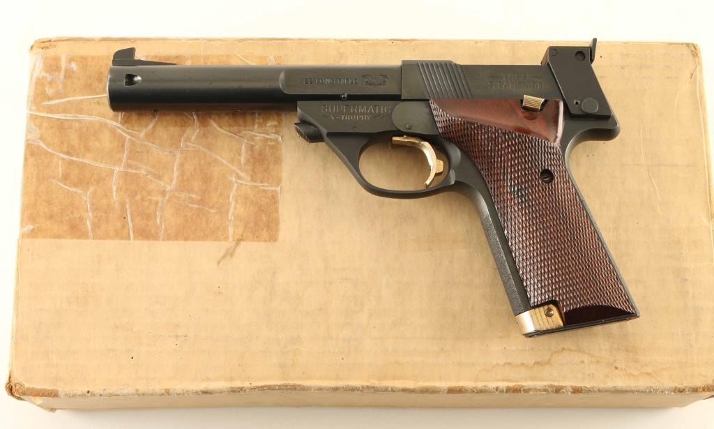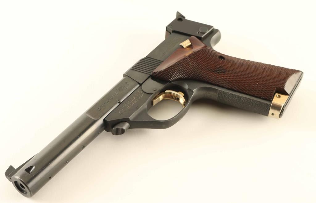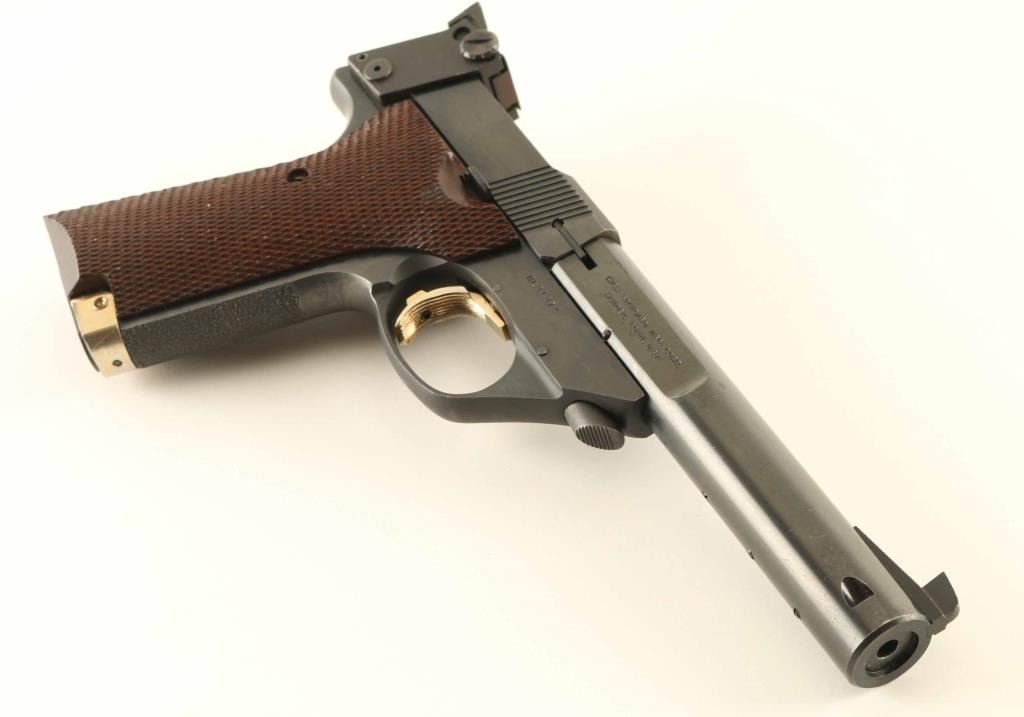 SN: ML31374 Semiautomatic rimfire pistol features blued finish, checkered wood grips, 5.5" bull barrel, adjustable sights, magazine release on bottom of grip, manual safety. Barrel has provision for mounting weights on bottom, gold color accents at trigger & mag release. Bore is excellent. Retains 98% high polish blue, with minor signs of handling and few small areas of bare metal on sharp edges. Grips are excellent condition. Includes good condition factory box, (1) magazine, factory instruction sheet. Condition is NRA Excellent - like new *** Modern Firearm ***