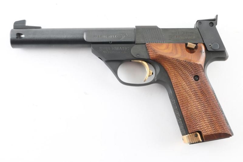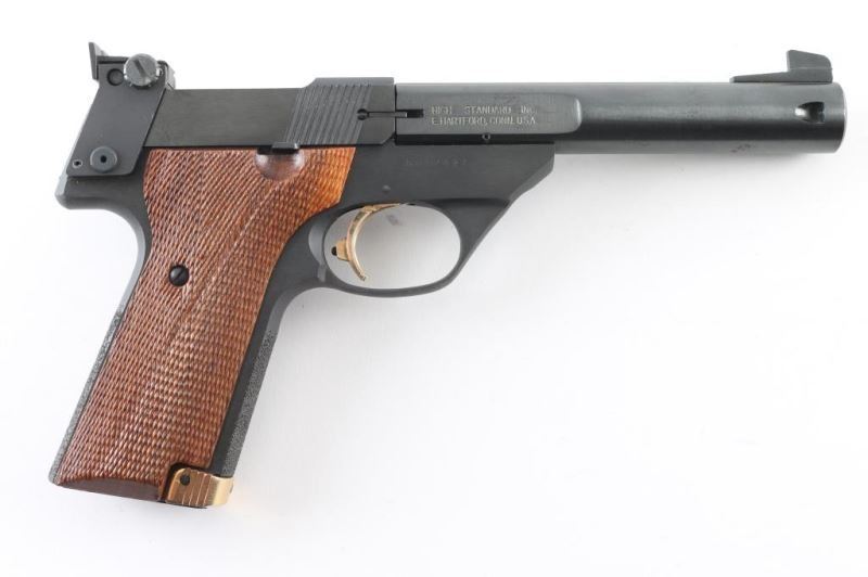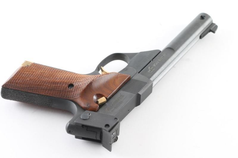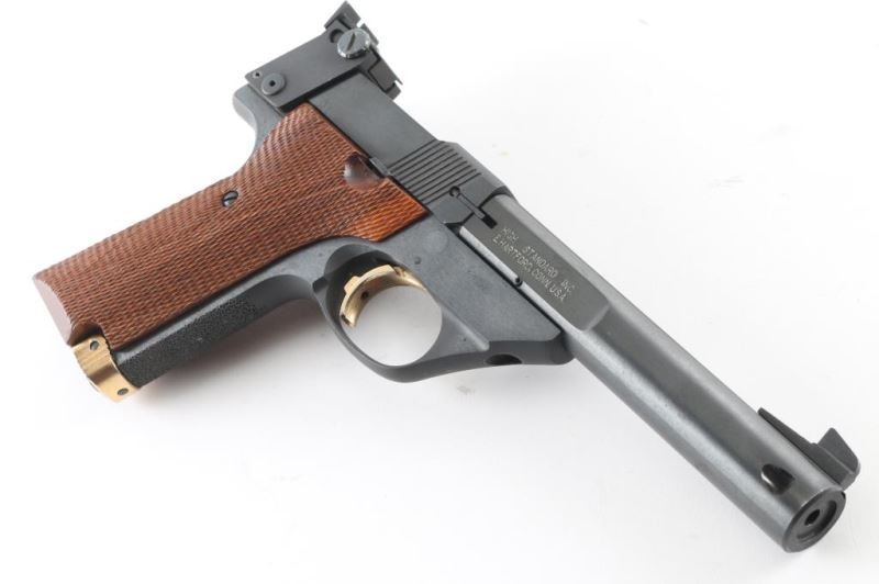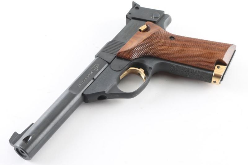 SN: SH17497 Semiautomatic rimfire pistol features blued finish, checkered wood grips, 5.5" bull barrel, adjustable sights, magazine release on bottom of grip, manual safety. Gold color accents at trigger, safety, & mag release. Bore is excellent. Retains 95% high polish blue, with handling marks, scratches, small edge losses, tiny spot of light patina on right side of frame. Grips are excellent condition. Includes (1) magazine. Condition is NRA Excellent *** Modern Firearm ***