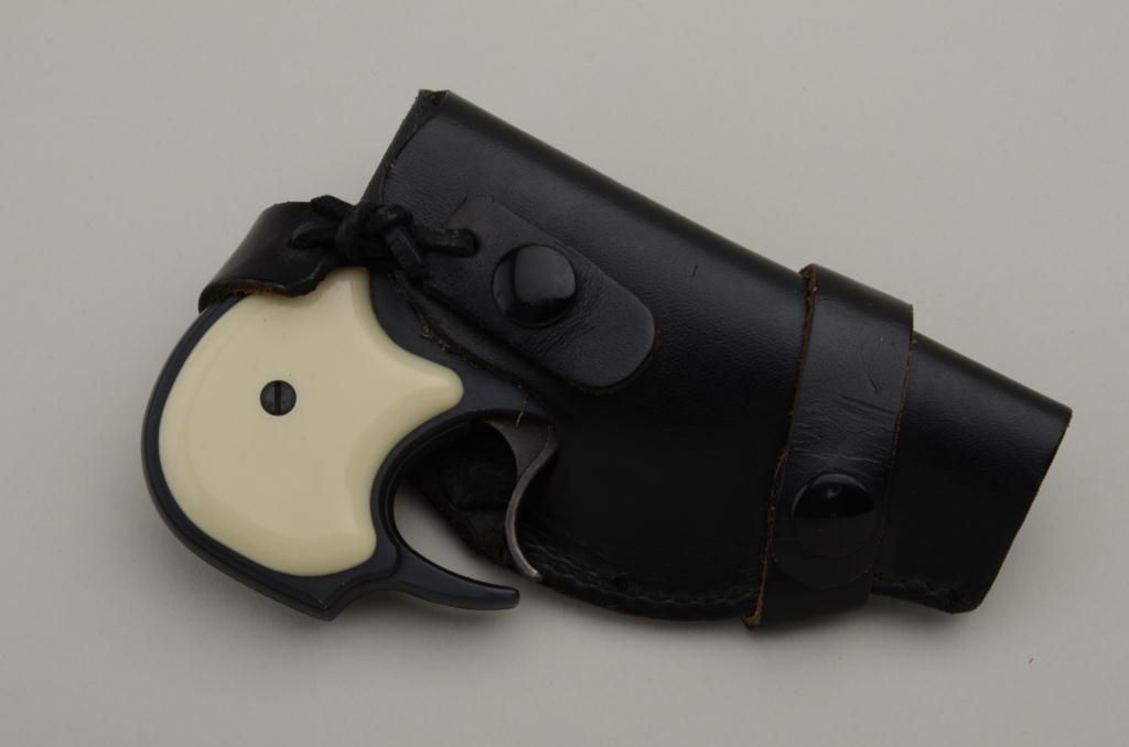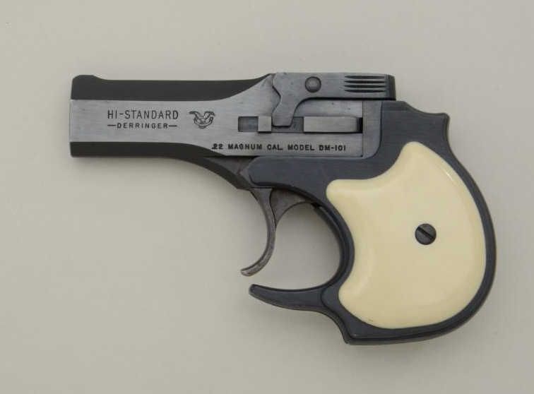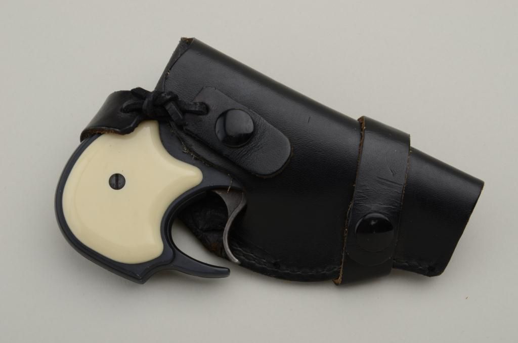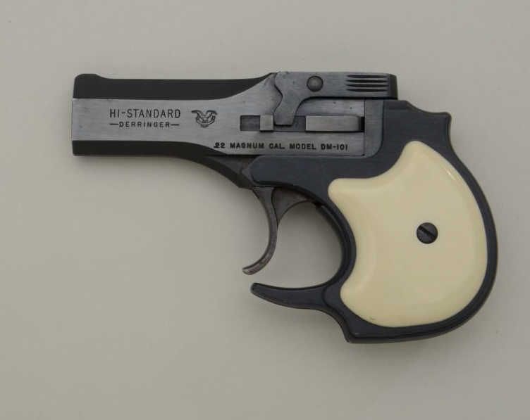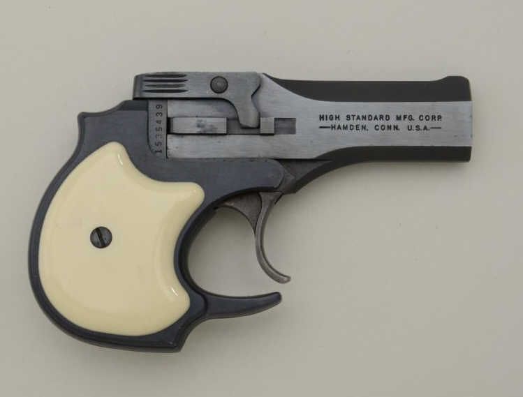High Standard over and under .22 Magnum caliber Model DM – 101 double action Derringer with leather holster. The out of production Derringer remains in very good used condition showing approximately 90% to95% original blue. There is some light normal wear the action works well and generally good overall. Serial number 1535439. Est.: $150-$300.