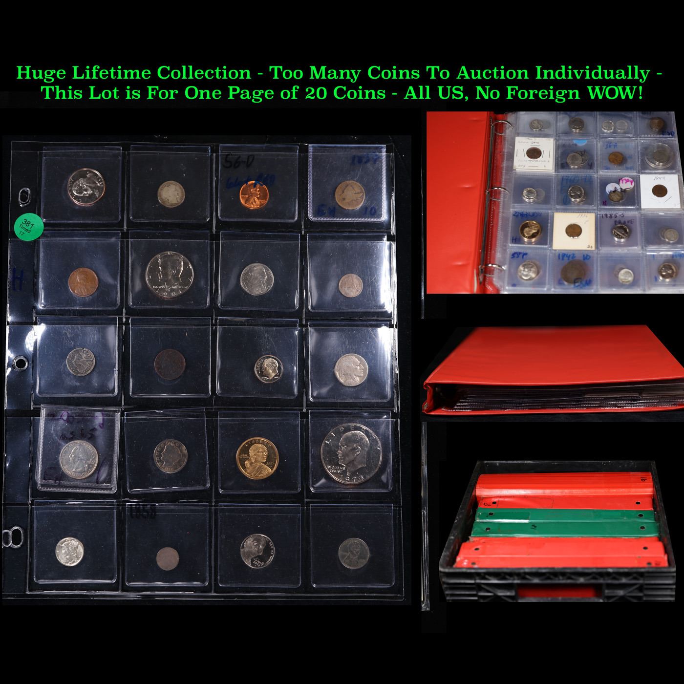 High Value-Huge Liifetime Collection - Too Many Coins To Auction Individually - This Lot is For One Page of 20 Coins HIGH VALUE - All US, No Foreign WOW!. We have received a huge collection of over 10 thousand US coins in flips, 2x2 holders, and 20 coin pages. We are forced, due to limited lots, to sell this collection in pages of 20 coins. All of the pages include Silver Coins. Most contain Indian Cents, Proof Coins, Barber Coinage, Bust Coinage, Lincoln Cents, Flying Eagles, Jefferson Nickels, Roosevelt Dimes, Buffalo Nickels, Eisenhower Dollars, Kennedy Halves, Large Cents including some Draped Bust Large Cents, Mercury Dimes, and Liberty V Nickels. These pages could not be reviewed by anyone in our office due to time constraints. We estimate the value of each page to meet or exceed $200 in value! Good luck and happy hunting.