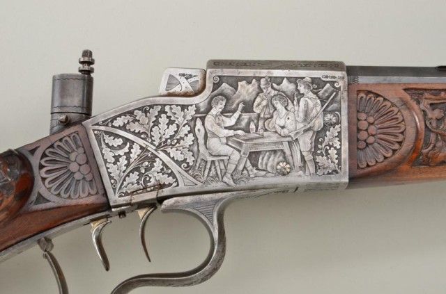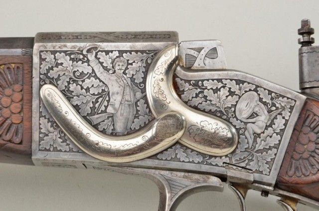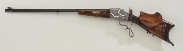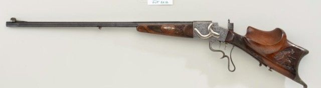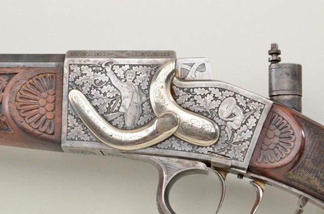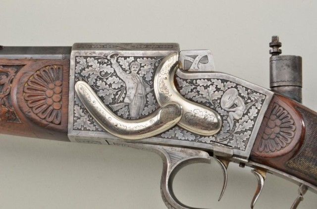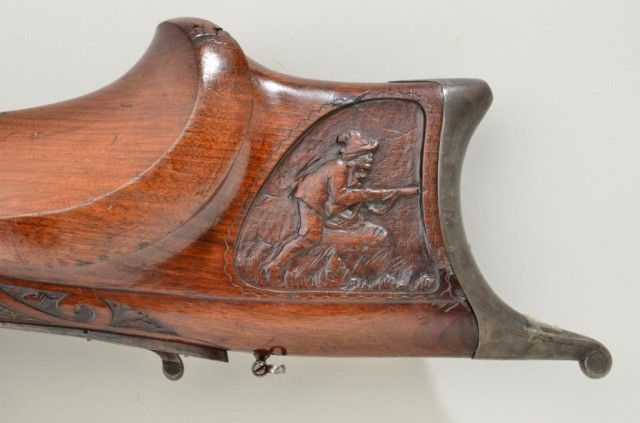 High art German Shutzen rifle on Aydt style action in 8x15x46r caliber with 30” fluted barrel showing makers mark of Archer at breech with beautifully engraved action in semi high relief and ornately carved stock.The left side of the receiver shows a cherub holding a target and a shooter waiving his hat. The right side of the receiver shows a beautiful scene of shooters and lady examining a tablet on a table with drinks onthe table. The scenes are surrounded in scrolls and oak leaves and the engraving is excellent quality. The stock shows a carved large panel on left rear of butt stock of hunter stalking with a rifle and the wrist in nicely carved with florals and checkered wrist, panels on fore end and decorative accents. The barrel retains 80-90% original blue aging and toning naturally with some minor aging and pinprick pitting. The action shows silvery case hardening with traces of rainbow colors. The stock is very good with a few minor bumps, mars, scratches etc. The bore is good and generally good overall. The eye piece for rear sight is missing, the