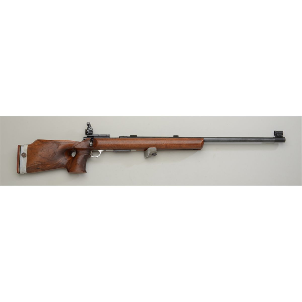 High grade Anschutz Model 54 Super Match target rifle, .22LR cal., 27-1/2” heavy round barrel, blue finish, deluxe adjustable rear sight, scope mounts and deluxe hooded front sight, thumb hole, pistol grip adjustablewood deluxe target stock with adjustable hard rubber and metal butt plate, #34225. This gun is in overall excellent condition showing the majority of its original finish, very good bore that should clean to fine, crispaction, sharp markings, overall very good to fine condition with some scattered mars and surface grime that would benefit from a simple cleaning. A very high grade German Target rifle with great sights. Est.:$800-$1,600.