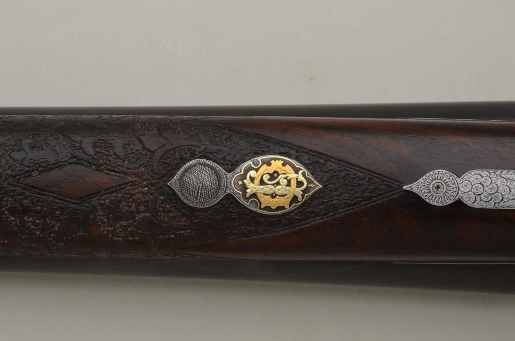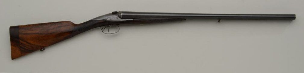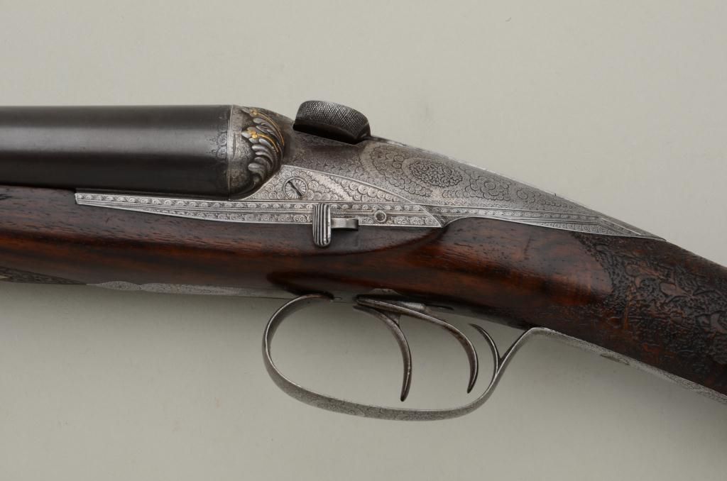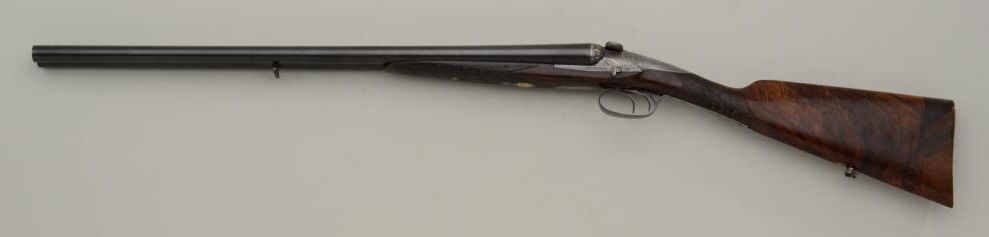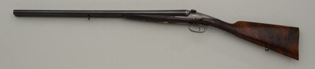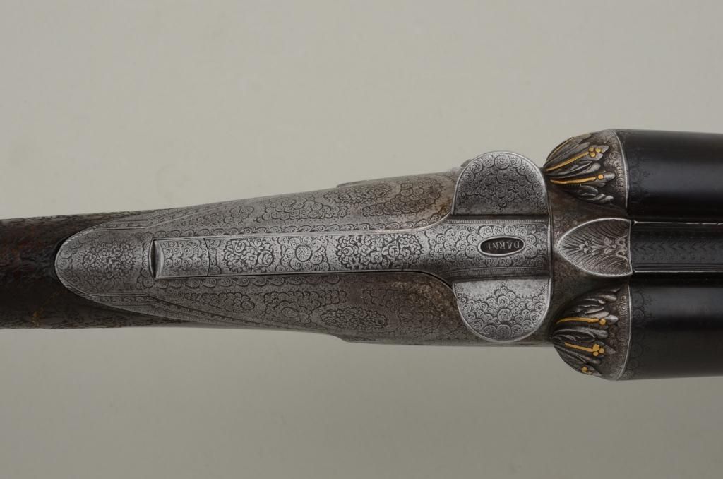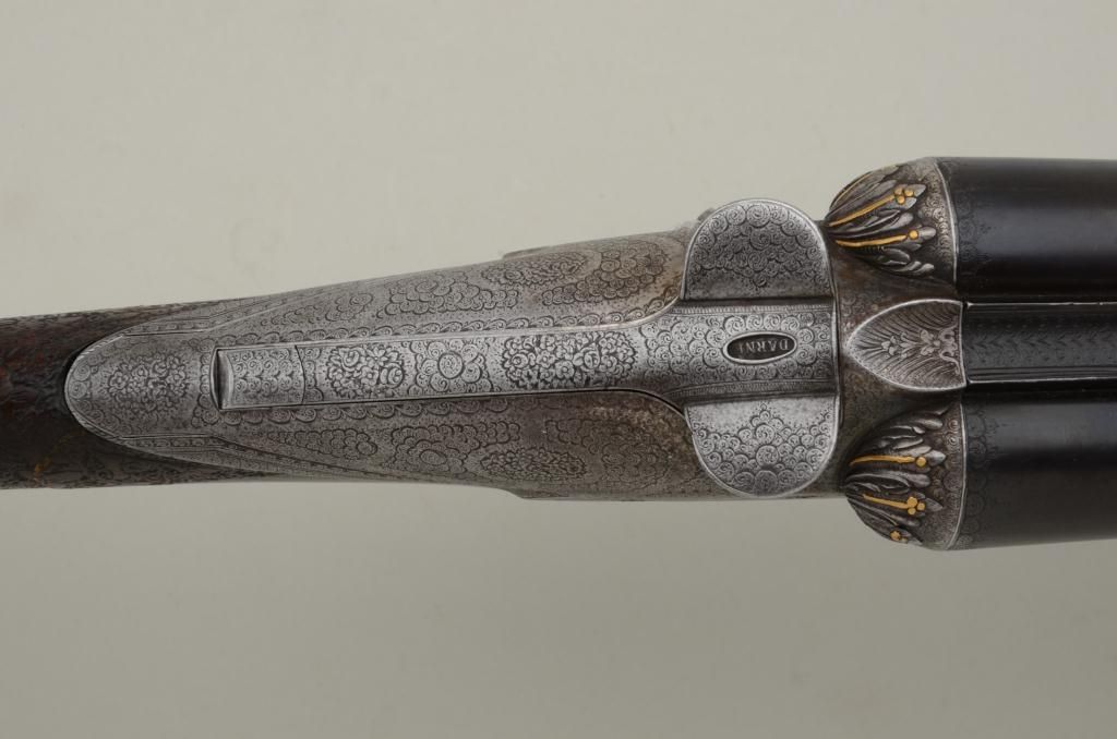 High-grade Darne double barrel side-by-side shotgun with patented Cannon breech in 12 gauge with 25 and nearly three-quarter inch barrel’s serial number 6901 interior of action and numbered 2900 and 8925 on interior of rib with serial number 690 also in front of the lug. The bottom of the water tables show a full set of French proofs from St. Etienne for smokeless powder, choked cylinder right, improved modified left. The barrelsretain 90% to 95% of the original blue just starting to age and tone nicely. The frame is highly engraved with fine scrolls and florals. The fences on the receiver show floral chiseling with gold inlay and thetrigger guard is engraved to match frame. The gun is stocked in burl walnut and carved with a pattern in the wood. The button release mounted in the bottom of the forend shows a multi-color gold inlaid with fancyintertwined initials which may be an D.L. There was a small plaque removed from the belly of the stock. The stock measures 15 inches to the end of the wood and there has been a 1 ½ inch piece of wood added to the