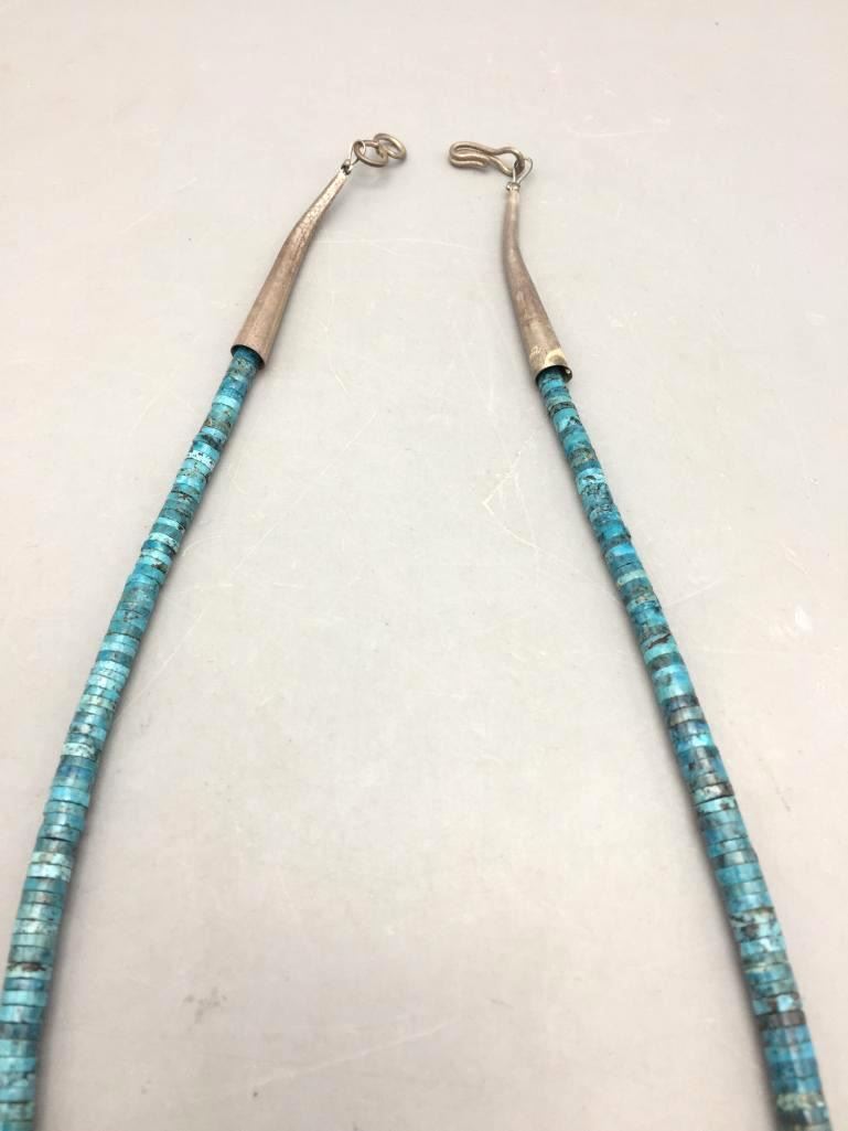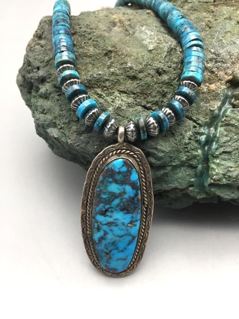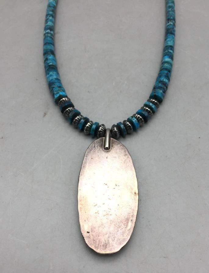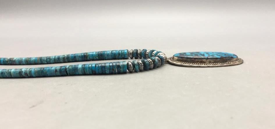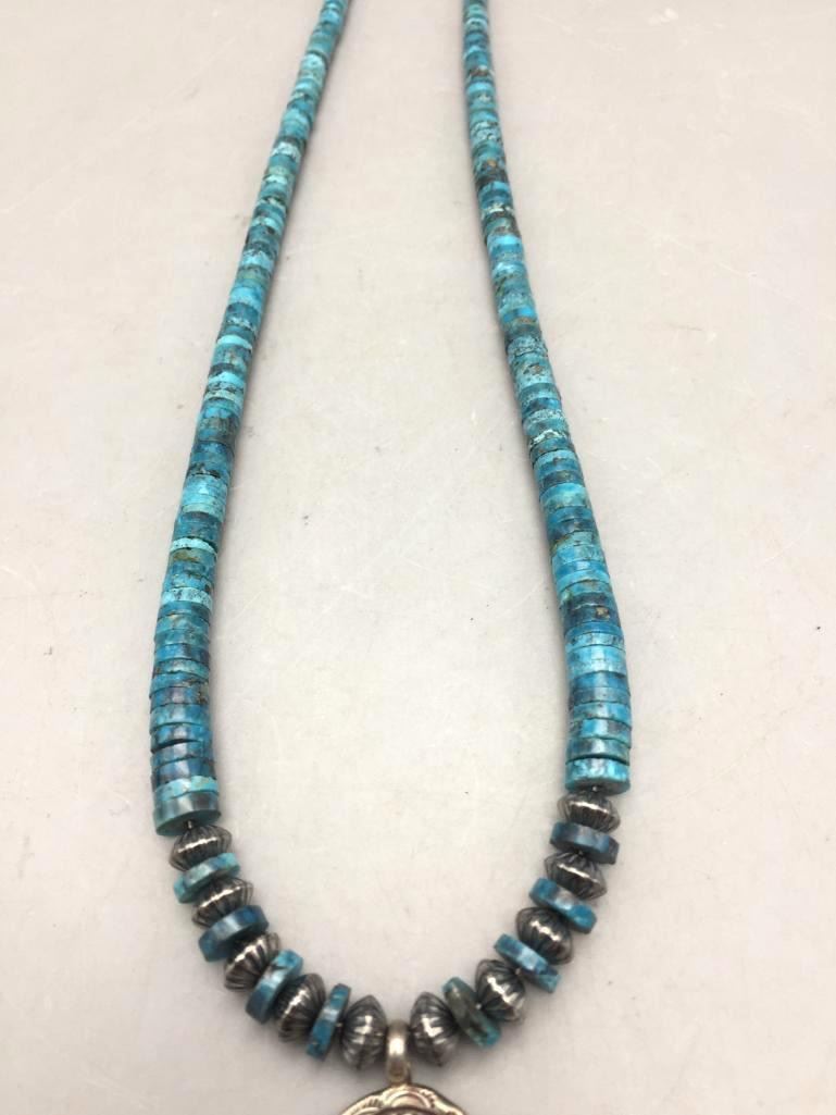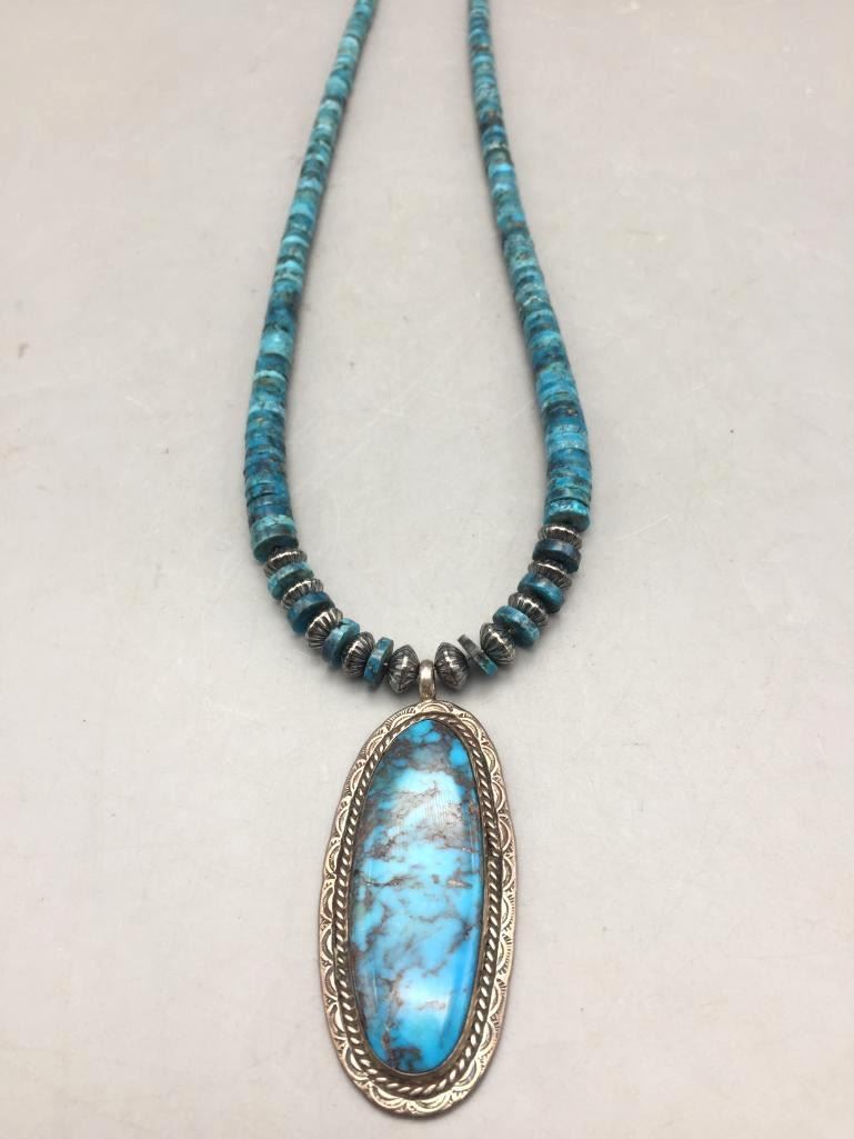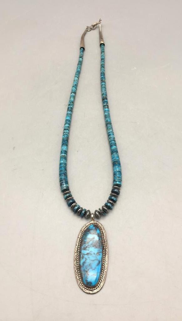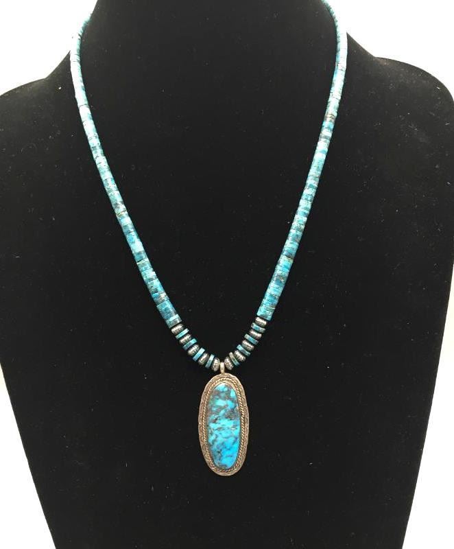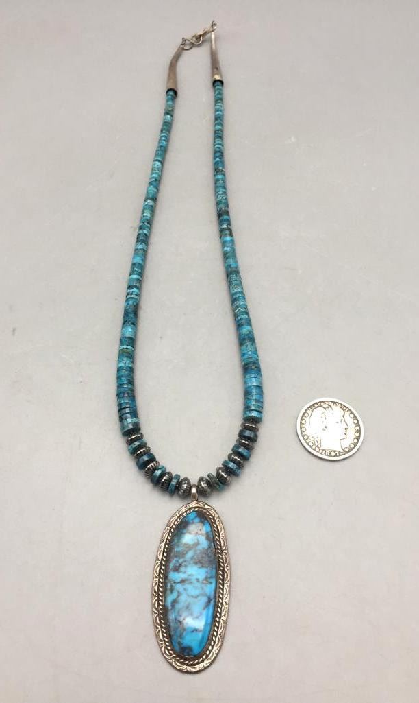 Presented for sale in this lot is a disk bead necklace featuring a high-grade turquoise pendant with sterling silver accents. The pendant is believed to be Candelaria mine turquoise, although some have thought Bisbee. Either way, it is a great looking piece of turquoise! Maker: Unmarked. Approx. Age: Vintage. Size: Fits a 20" neck. Pendant measures 2-1/4" x 1'. Weighs 43.4 grams. Condition: Good for its age, normal wear expected. Please look closely at the pictures - they are an important part of our description. Shipping: There will be a $5 handling / packaging fee for shipping this lot. The actual cost of postage will be added on top of that.