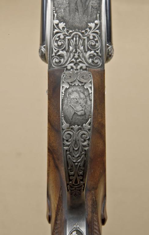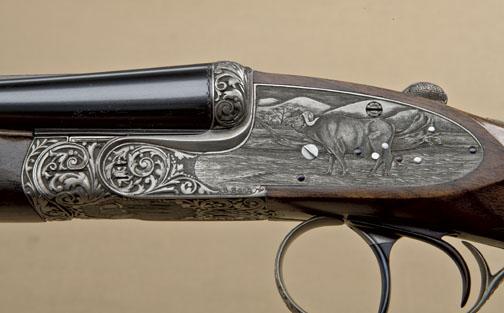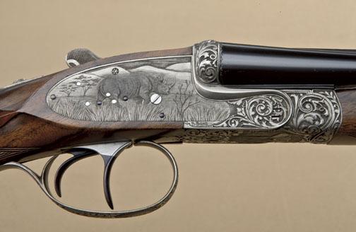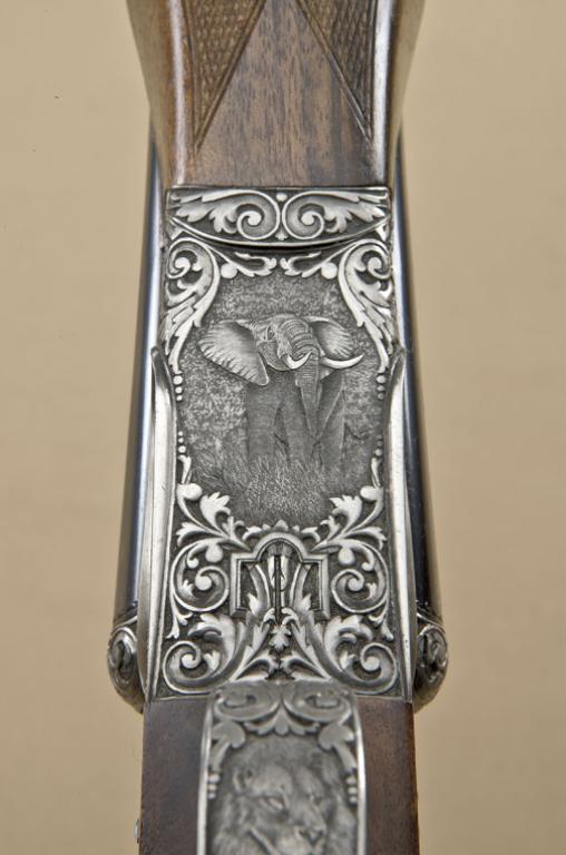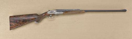 High-grade best-quality sidelock double-barrel sporting rifle by Marshall Thys & Sons in .22 Hornet caliber, fully and finely high-art engraved in scroll and high-art motifs, serial #0185. The riflemeasures 24-3/8”, 40-1/2” overall, the gun shows double triggers with front trigger articulated or hinged, automatic ejectors, raised African type rib for v-notch rear sight, stocked in select burl walnut withwrap-around forend, squared bottom, European type pistol grip, monte carlo cheekpiece, checkered wood butt, reinforced big game type tang that extends onto the comb. The rifle weighs slightly under 7lbs. The engraving isof highest grade European quality with fine-line backgrounds, raised figure of buffalo on left sideplate, Rhino. Bottom of frame shows bull elephant on rampage, triggerguard shows majestic lion inportraits. Panels and vignettes are surrounded by high relief chiseled scrolls. The name Marshall Thys is engraved on the rib, the rib is hand filed and engraved at the front ramp and the front sight is