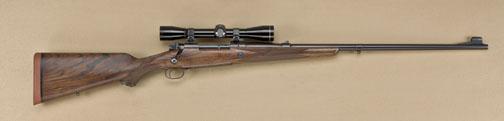 High grade custom rifle on Model pre-64 70 barreled action in .300 H&H magnum caliber serial #255127. The rifle shows 26-1/2” factory barrel and is mounted with a Leupold 6-power scope on rail type hand-releasemounts. Showing a rear folding sight, standard front sight, bolt reinforcement at front of action near stock, European style studs for hook swivels. The metal pistol grip cap with quick-release floorplate. The rifle is nicely polished and rust-blued. The gun is stocked in select walnut with monte carlo cheek piece and satin finished. The condition is near fine with some slight storage loss to the front sight cover which is minimal.The stock measures 13” to the end of the wood, 14” to the end of the pad. The action has been polished and honed. The bore is excellent. The rifle has seen little use and is 97-99% since its customization. Thetrigger is 3.5-4.5lbs with a positive release. Although this rifle is not signed it is of high quality and probably built for Mr. Petersen personally as it has all the features he was known to desire. From the