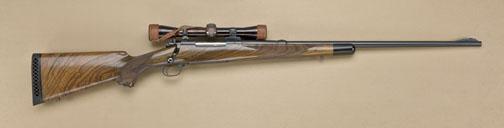 High grade custom rifle on Winchester pre-64 Model 70 barreled action, .264 Winchester caliber, serial #470157. The rifle shows a Leupold scope on Bueller mounts. The rifle is nicely stocked in select walnut with crispcheckering. Fancy forend cap, nicely made quick release floorplate, metal grip cap with trap. The metal surfaces show a matte finish on the barrel and action, high polish on floorplate, triggerguard, grip cap. The stock shows a few bumps and mars. The stock measures 13-1/2” to the end of the wood, 14-1/8” to the end of the pad. The action shows engine turning as does the follower. The bore is excellent, the trigger is about3-4lbs. Although not signed, a high quality rifle made for America’s number one sportsman in the caliber he liked for long-range sheep hunting. From the Robert Petersen collection. Est: $1,250 - $2,500