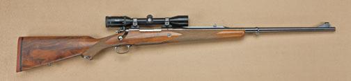High grade custom sporting rifle by George Hoenig of Boise ID, on Winchester pre-64 action, serial #537162. The rifle shows an African type rib with adjustable rear sight, changeable aperture front sight with hinge cover. The rifle is stocked in select quality walnut with a nice grain, cleanly checkered with a satin type finish>T he stock shows bolt reinforcements and quick datable sling swivels with fancy pistol grip cap. The rifle is mounted with a Swarovski 3x9 power Nova scope on rail mounts. The rifle shows finest quality workmanship and detail throughout which this gunsmith is famous for. Fine to excellent condition, 98-99%From the Robert Petersen Collection. Just slight handling and storage marks. Est: $2,000 - $4,000