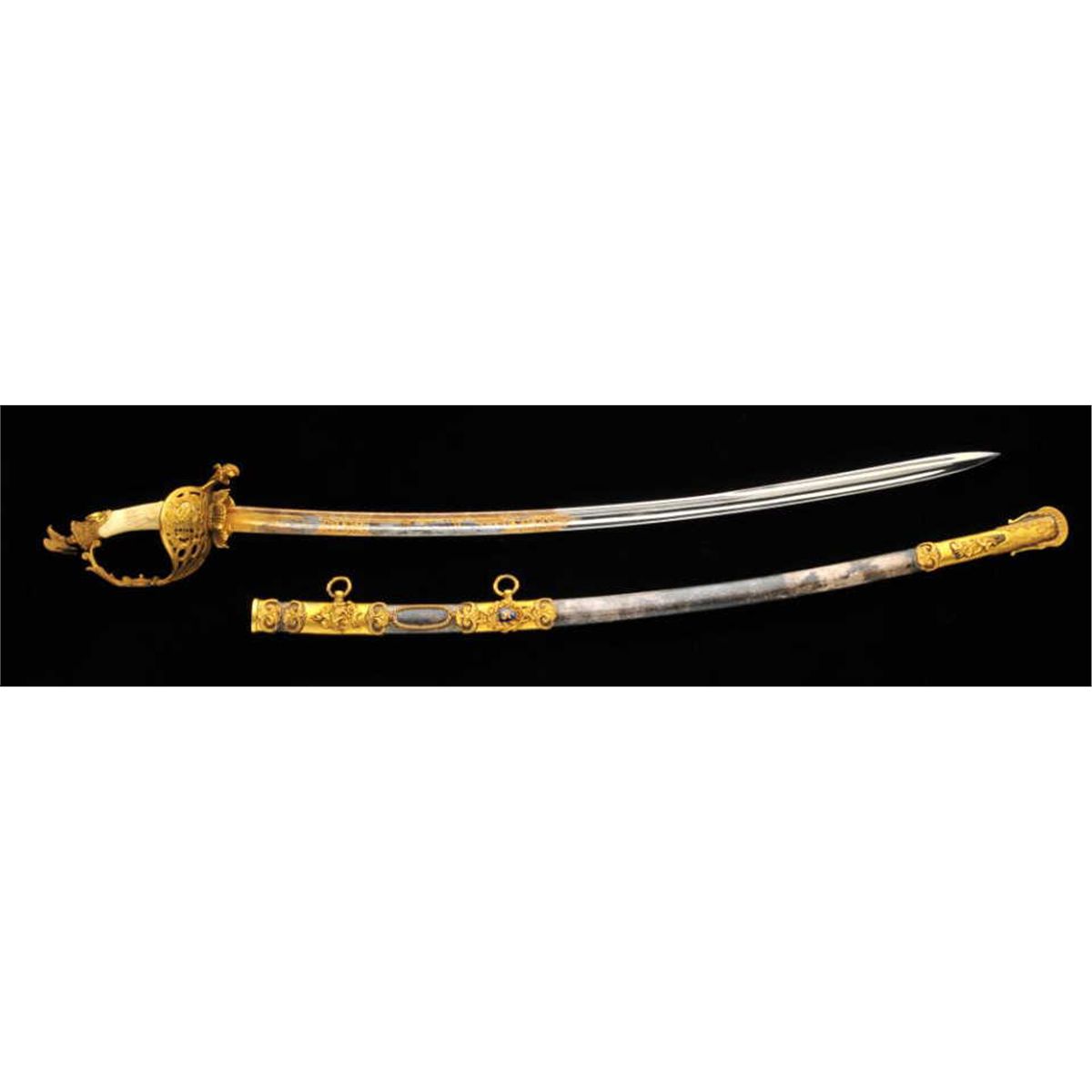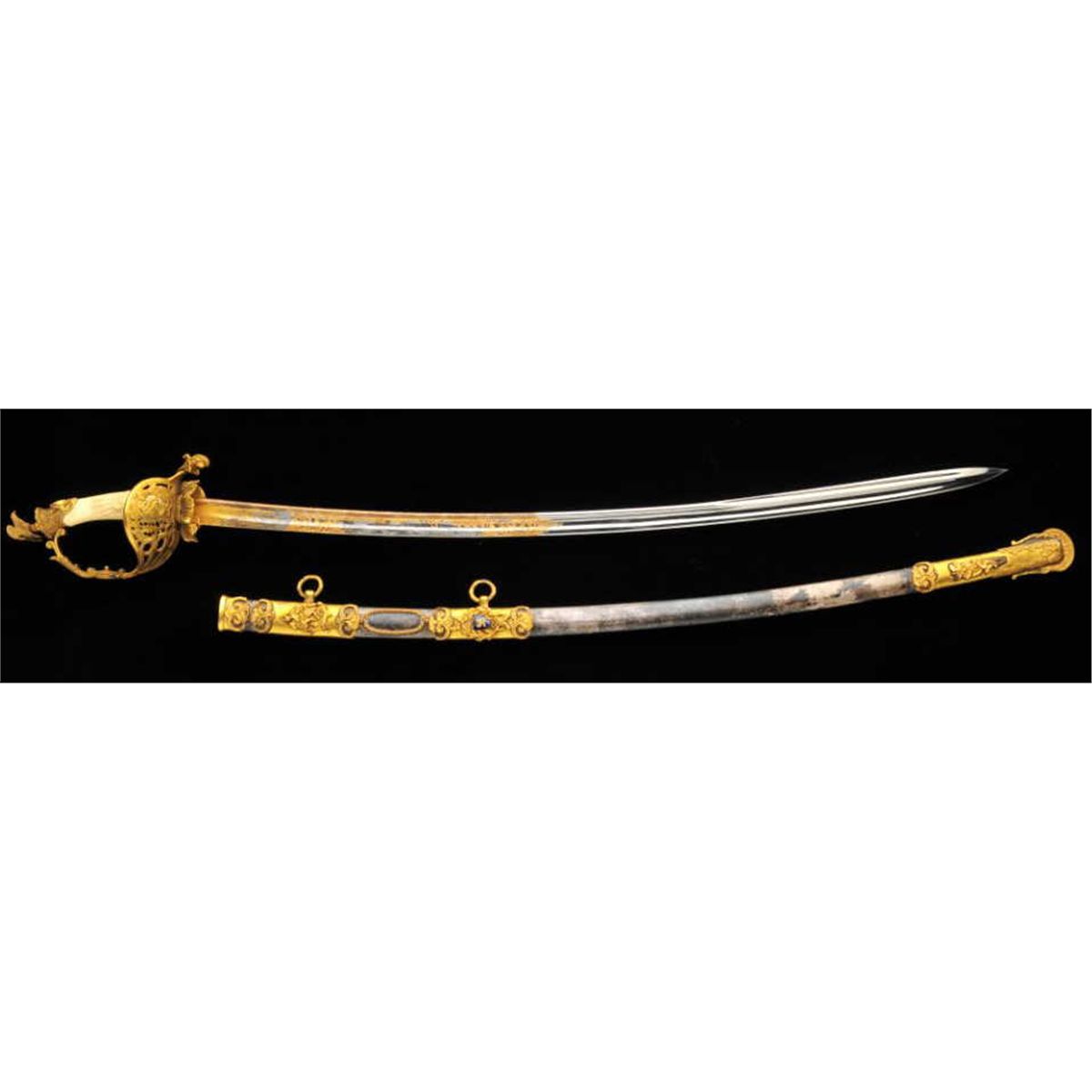 High grade presentation Civil War cavalry officer’s sword inscribed Presented to Col. W. B. Sipes 7th Regiment Penn. Veteran Cavalry / By the friends of the Regiment / 1864”. The sword shows a raised carved ivorygrip with American Eagle on Union Shield surrounded by stand of arms in high relief with floral borders on each side of the mounts. The pommel shows a large cut purple gemstone, possibly amethyst with largeAmerican Eagle mounted on the cap of the pommel. The guard is extremely fancy with five branches to the piercing. “US” in wreaths with fancy foliate scrolls. The scabbard shows raised relief appliqués and afigural of Sir George slaying the dragon, a wreath between the presentation plaque shows a blue enameled shield with the letter “S” set in small cut stones that may be diamonds. The drag shows an appliqués in relief offlowers. The hilt and mounts are gold plated, scabbard is silver plated. The blade is fancy etched with gold gilt showing a battle scenes, stands of arms, and florals. Approx. 80-90% gilt remains with nearly 100% of the