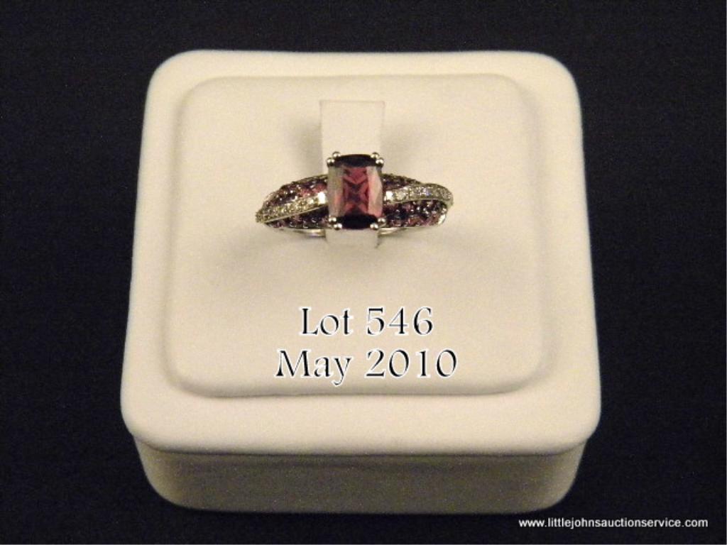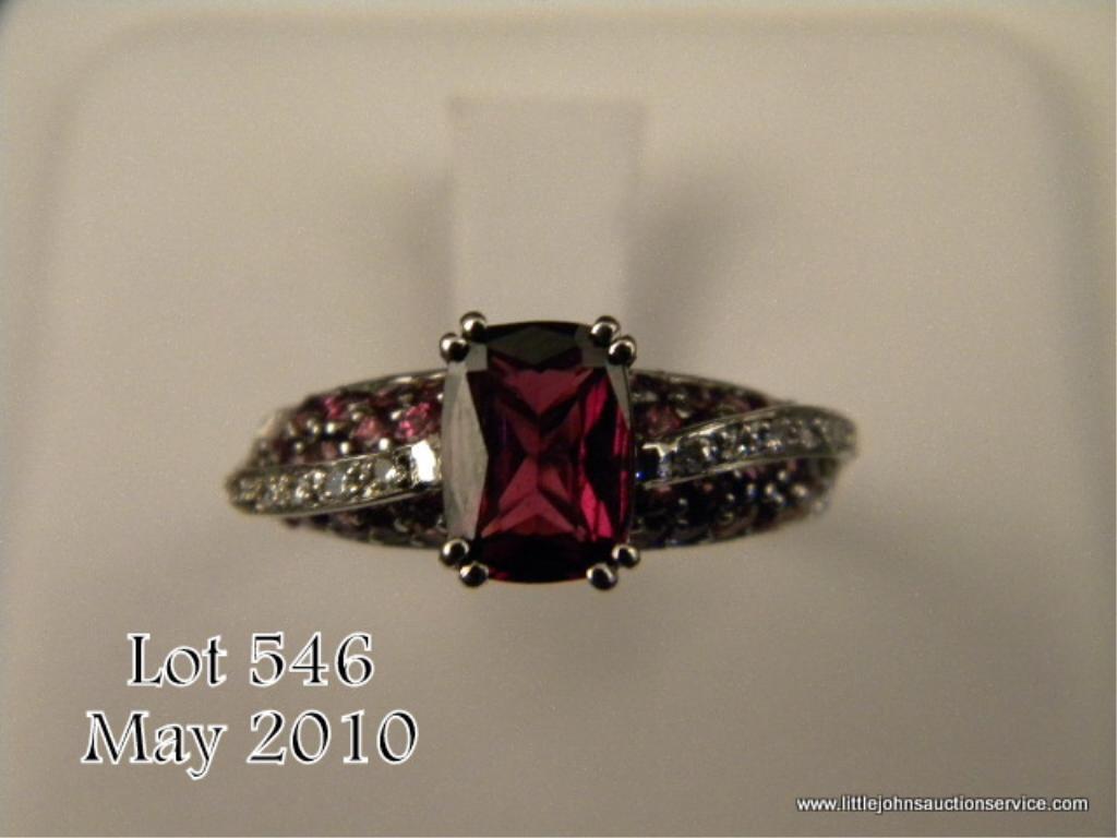 High quality 10 karat white gold ladies ring set with a center fine red/ purple garnet weighing approx. 1.80 carats and pave set with over 46 round diamonds and garnets weighing approx. 1.00 carat. Retail $1,250.00 Estimate $300-$500 a niceitem