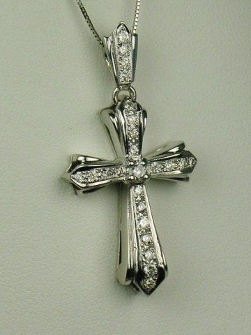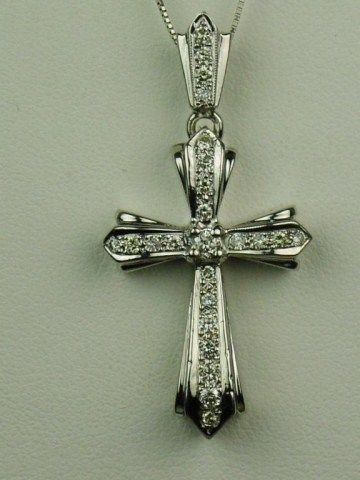 High quality 14 karat white gold ladies custom made cross pave set with 23 round “IDEAL’cut diamonds weighing approx. 0.80 carats of G-H colors and VS/SI clarity. Retail $2,000-$2,500 Estimate $1,000-$1,500Please note detail work
