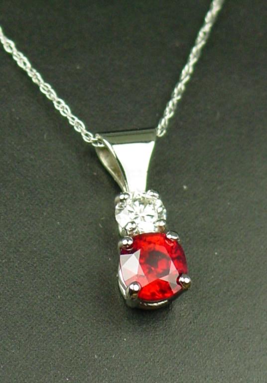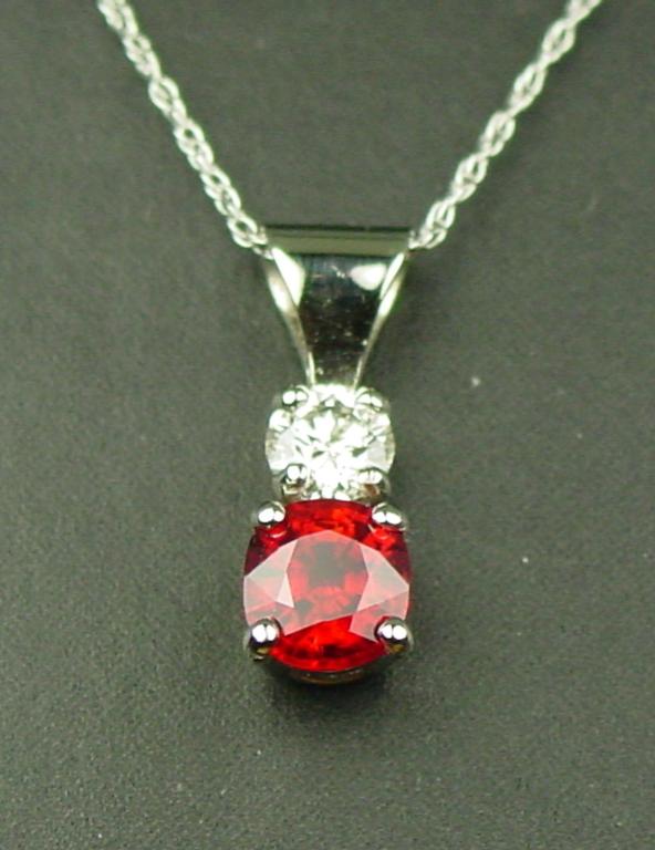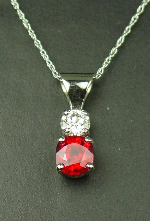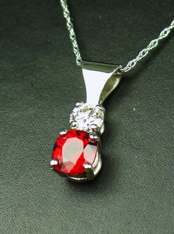 High quality 14 karat white gold ladies  custom made pendant set with a center extra  fine red Ruby weighing 1.03 carats and side  diamond weighing 0.28 carats of G-H color and  VS/SI clarity. Retail $6,000.00 Estimate$1,800-$3,000 Please see full appraisal