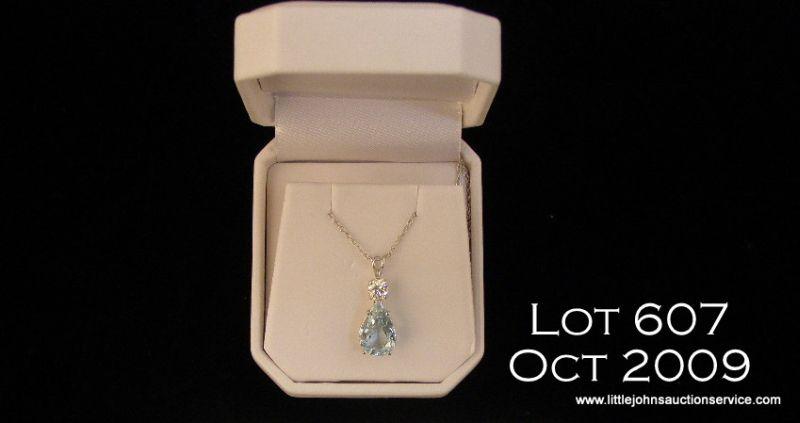 High quality 14 karat white ladies custom made necklace set with a fine pear shape blue Aquamarine weighing 5.01 carats and a fine round brilliant cut diamond weighing approx. 0.60 carats of H-I color and VS clarity. Retail $3,450.00Estimate $800-$1,200. Featured item.