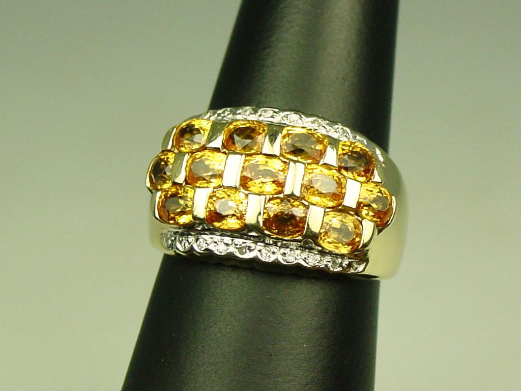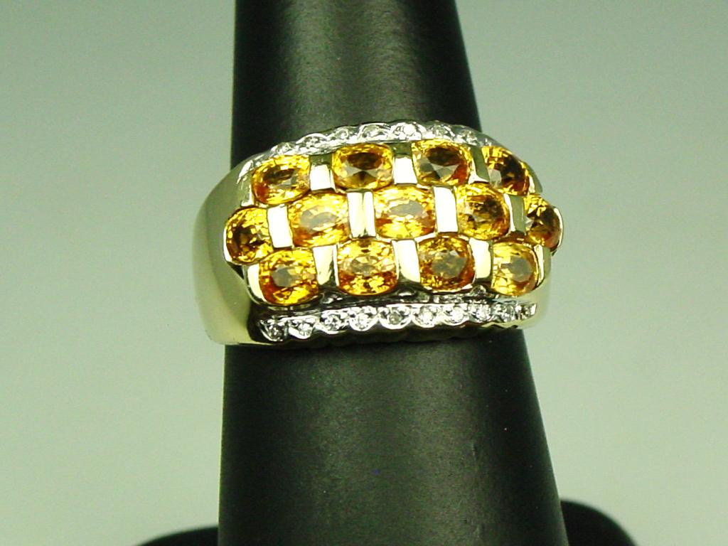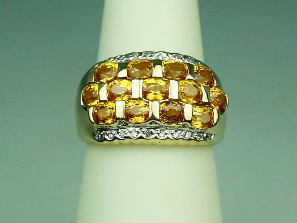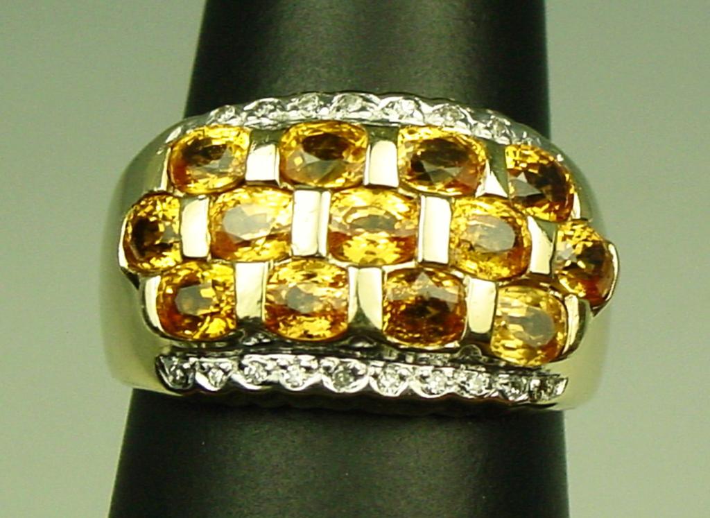 High quality 14 karat yellow gold ladies custom design ring fine set with 13 oval orange Sapphires weighing approx. 4.00 carats and pave set with 18 round diamonds weighing approx. 0.10 carats of H-I colors. Retail$2,250.00 Estimate $600-$1,200