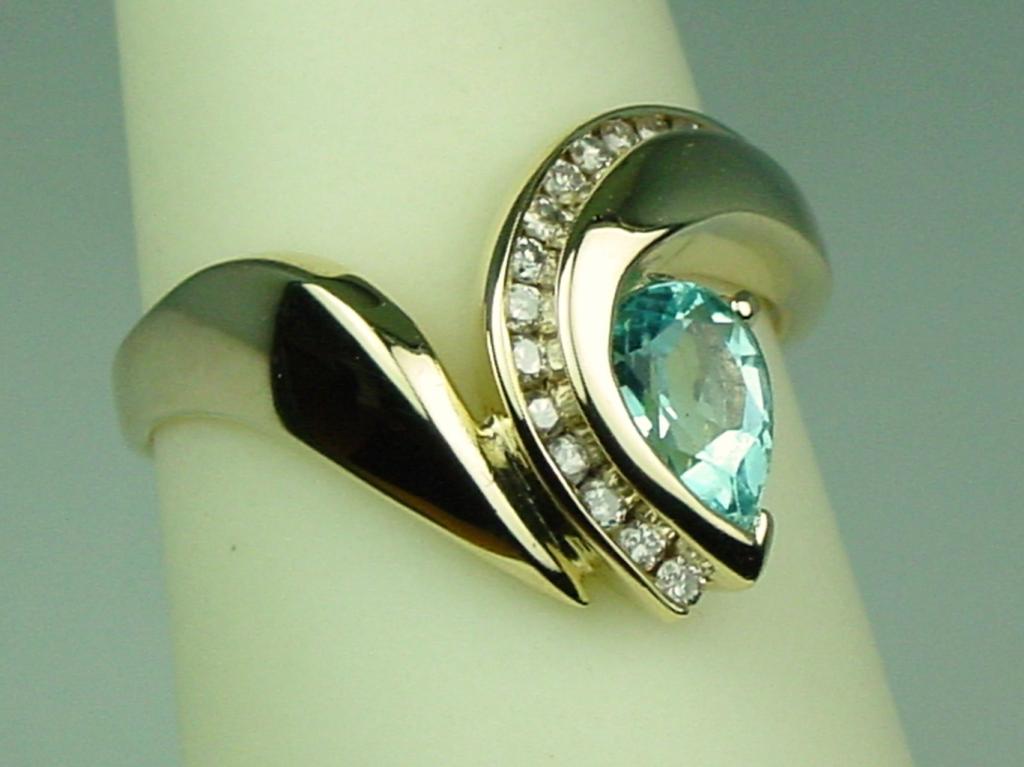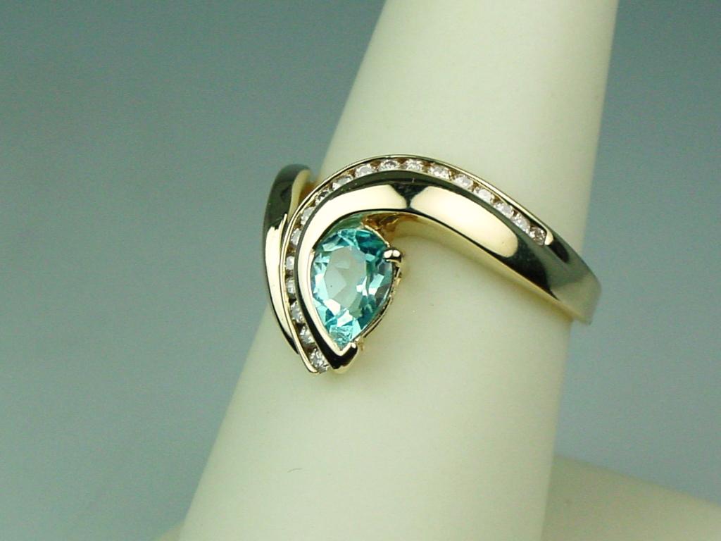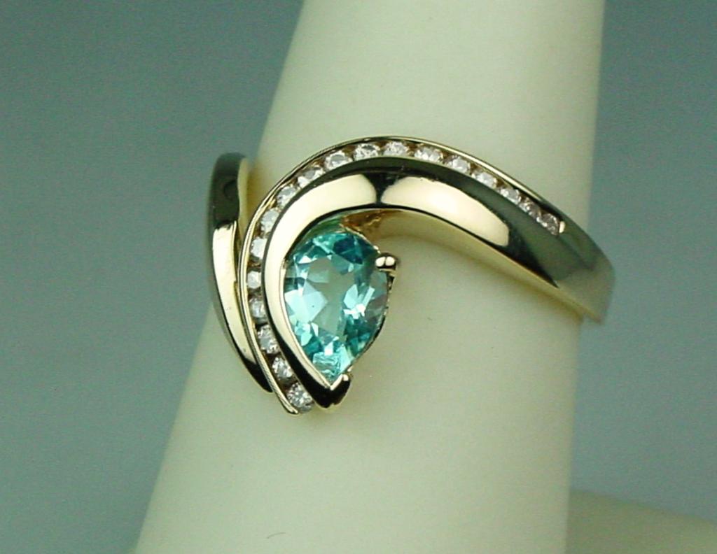 High quality 14 karat yellow gold ladies  custom made contemporary design ring set with  a center pear shape blue green Aquamarine  weighing approx. 1.00 carat and channel set  with 18 fine round diamonds weighing approx.0.25 carats of G-H colors and mostly VS  clarity. Retail $1,950.00 Estimate $600-$1,000