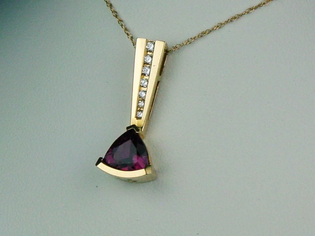High quality 14 karat yellow gold ladies custom made necklace set with a fine trilliant cut red tourmaline/rubellite weighing approx. 1.50 carats and channel set with 7 round ‘Ideal’cut diamonds weighingapprox. 0.20 carats of G-H colors and VS clarity. Retail $1,500-$2,000 Estimate $600-$900