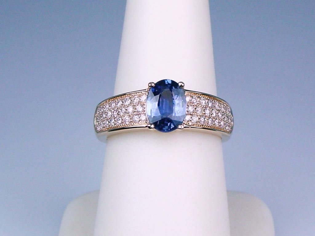 High quality 14 karat yellow gold ladies custom made ring by ‘VJ’ set with a center oval cornflower blue sapphire weighing over 1.00 carat and pave set with 48 round diamonds weighing approx. 0.60 carats of G-Hcolors and SI clarity. Retail $2,500-$3,000 Estimate $1,000-$1,500 Labor intensive