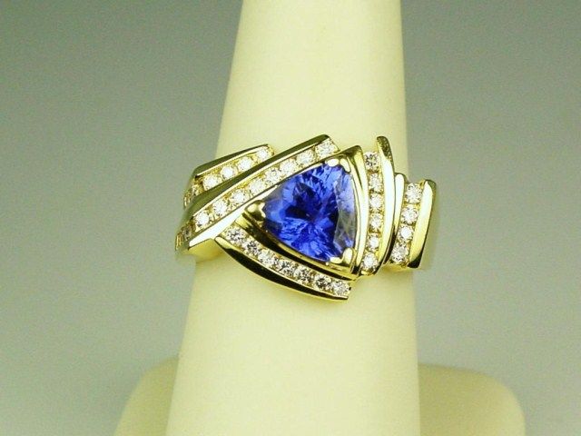 High quality 14 karat yellow gold ladies custom made ring set with a AAA quality trilliant cut Tanzanite weighing approx. 2.50 carats and channel set with 34 close to ‘IDEAL’ cut diamonds weighing approx. 0.80carats of F-G colors and mostly VS clarity. Retail $4,000-$5,000 Estimate $2,000-$3,000 A fine item