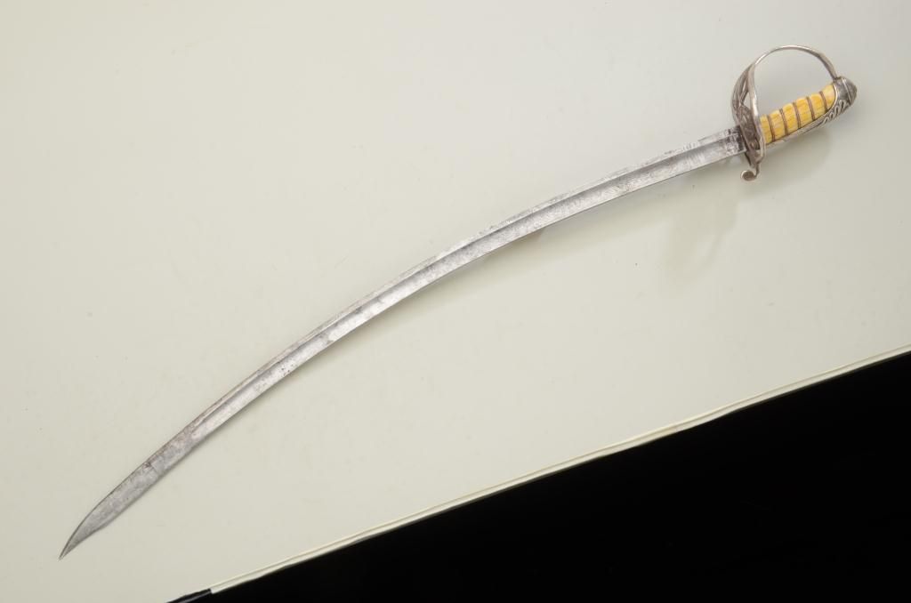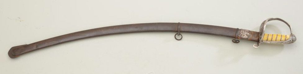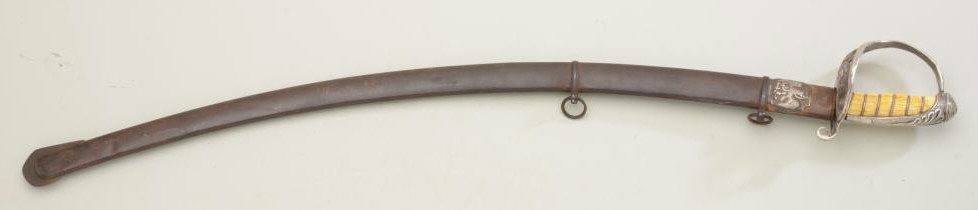 High quality 19th century Mexican Officer's sword with cast silver hilt, original scabbard showing overlay of Mexican snake and eagle. The blade measures 33", the sword measures 36" overall and shows a genuineivory grip wrapped with a single strand of silver wire. The hilt is heavy cast coin silver, and shows a Maximilian type Mexican snake and eagle supporting the Hapsburg crown. The blade shows a clipped point andis nicely etched with florals and stand of arms, shows no makers mark. The blade is good with some erosion and pinprick pitting, but most of its original polish and about 50% etching. The ivory grip shows deep yellowpatina, small losses, slight smoothing, normal aging. The scabbard shows a deep brown, a couple of dents, and the silver overlaid plaque of Mexican snake and eagle shows no crown, indicating the period afterMaximilian. Many officers in the Mexican Army changed sides after Maximilian was killed, and the plaque is old dating to the period of the sword's use. Est.: $1,500-$3,000