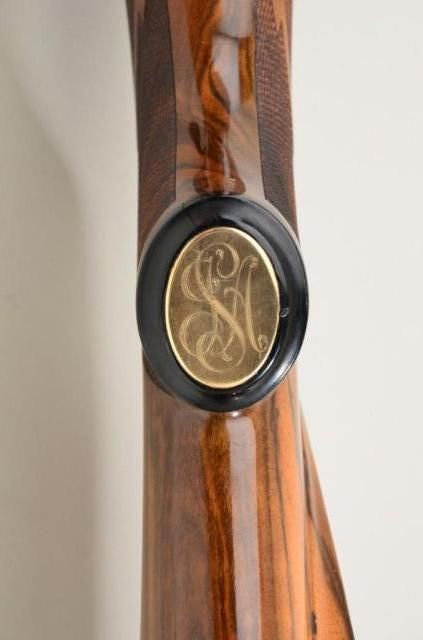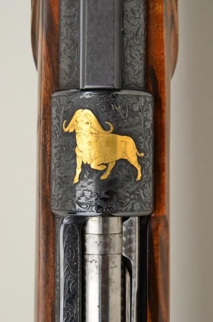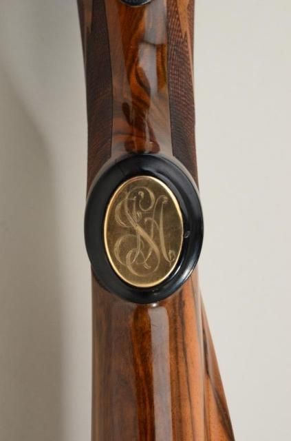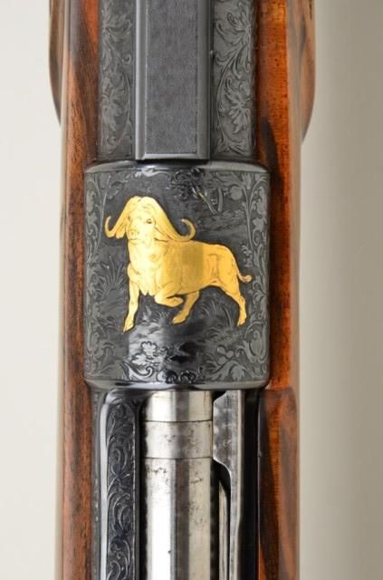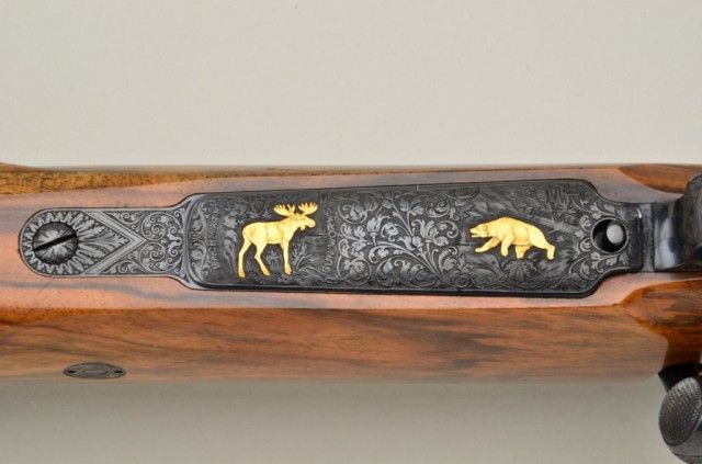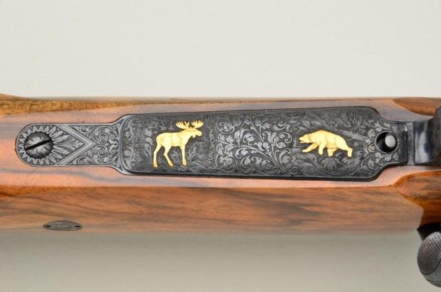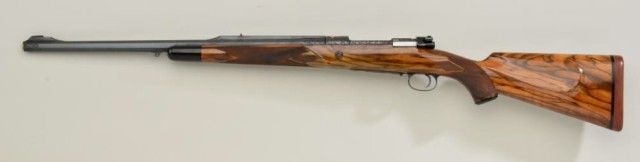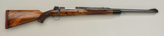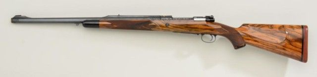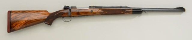High quality African big game sporting rifle in 458 Winchester magnum caliber on 98 Mauser action signed, custom made by Pachmayr, L.A. California. The rifle is finely engraved and gold inlayed with best quality selectburl walnut stock. The barrel measures 24” and the rifle is 44” overall and weighs approx 9lbs. The barrel shows round to octagon with raised and hand filled ½ length rib. The rifle is fitted with iron sights.The breech is beautifully gold inlayed with a figure of Cape buffalo and the floor plate is inlayed with figure of bull moose and grizzly bear. The action and rear end of barrel are Germanic style, deep scrollengraved. The action is jeweled and rifle has an adjustable trigger, the condition is fine to excellent with some slight use. The checkering is finely accomplished with fancy pattern. The initials “JSA” are engraved inscript on the grip cap. The rifle is fitted with a hard rubber recoil pad. Formerly Robert I Petersen, collection. This rifle would cost in excess of $20,000 to have a top quality custom gunsmith re-create in our