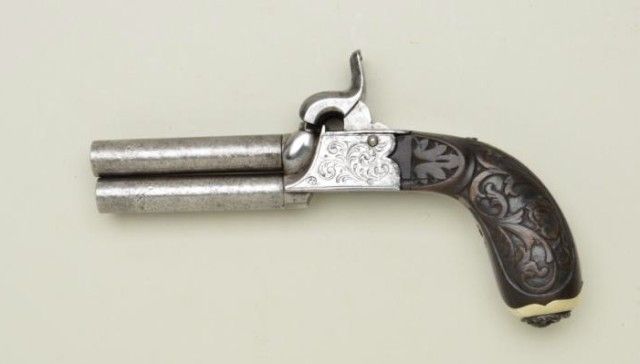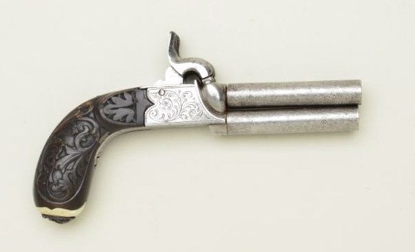 High quality Belgium double barrel over and under percussion pistol with side by side mounted twin hammers. The pistol measures 8-1/2" overall with 3-1/4" barrels approx. 41 caliber. The barrels show a false damascusdecoration with carved wood grip and lion headed cap box in butt. The frame is scroll engraved, the condition is very good with some slight pitting and minor wear to carving on grip. A bigger and better than averageBelgium double barrel of the mid 19th century. Est.;$600-$1,200.