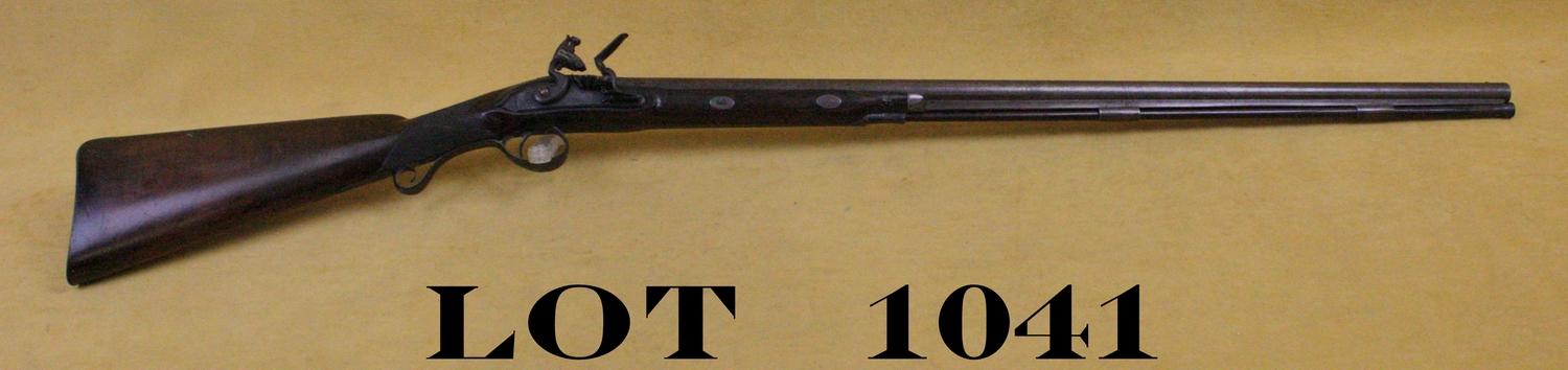 High quality English flintlock by Procter of London, circa approx. 1810 - 1830. The gun is 14-16ga with 31" barrel and weights only approx. 6lbs. It is half-stocked in good walnut with checkered wrist, silverescutcheons, double gold bands and breech. The stock measures 14" to butt. There has been a replacement of wood around the lock and light refinishing. The gun shows some original brown on the barrels. The frizzenspring roller bar is lost, otherwise lock is good. A good overall flintlock fowler by a premium London maker. Est: $600 - $1,200