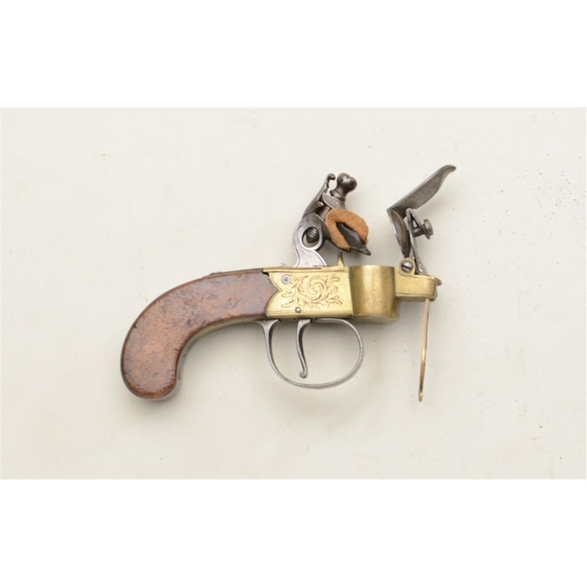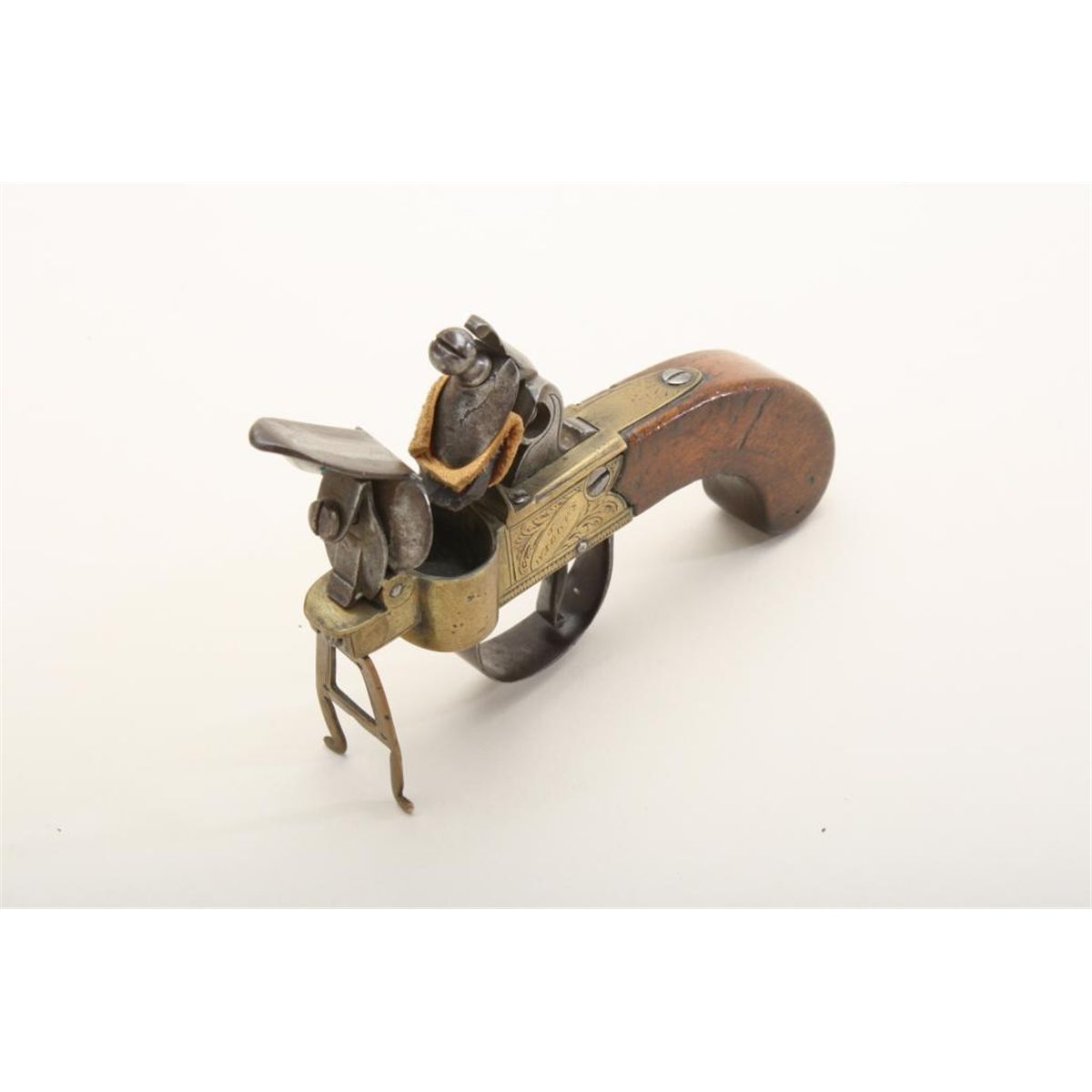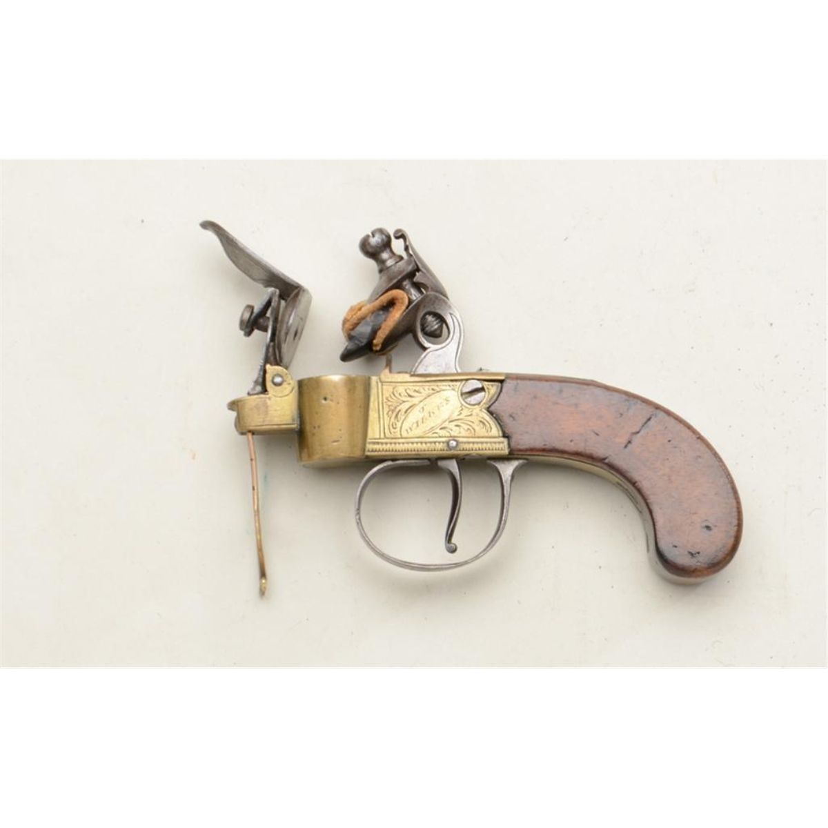 High quality English flintlock tinder lighter signed J. Wilkes. Made similar in style to small center-hammer pocket pistol of the early 1800 era, measuring only 4-1/2” overall. Nicely engraved brass body, bagshaped wood grips are very good with a few nicks, mars, scratches. Generally very good overall, and all original. A very cute and diminutive tinder lighter. From the Keith Coulter collection. Est: $450 - $900
